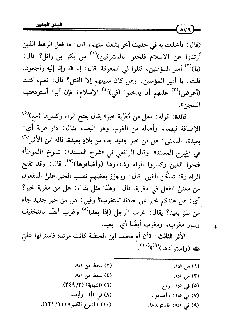 (قَالَ: فَأخذت بِهِ فِي حَدِيث آخر يشْغلهُ عَنْهُم، قَالَ: مَا فعل الرَّهْط الَّذين ارْتَدُّوا عَن الْإِسْلَام فَلَحقُوا بالمشركين) من بكر بن وَائِل؟ قَالَ: (يَا) أَمِير الْمُؤمنِينَ، قتلوا فِي المعركة. قَالَ: إِنَّا لله وَإِنَّا إِلَيْهِ رَاجِعُون. قلت: يَا أَمِير الْمُؤمنِينَ، وَهل كَانَ سبيلهم إِلَّا الْقَتْل؟ قَالَ: نعم، كنت (أعرض) عَلَيْهِم أَن يدخلُوا (فِي) الْإِسْلَام؛ فَإِن أَبَوا استودعتهم السجْن» .