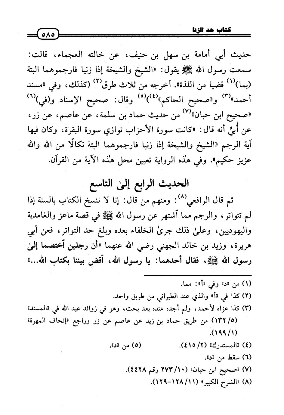 حَدِيث أبي أُمَامَة بن سهل بن حنيف، عَن خَالَته العجماء، قَالَت: سَمِعت رَسُول الله - صَلَّى الله عَلَيْهِ وَسلم - يَقُول: «الشَّيْخ وَالشَّيْخَة إِذا زَنَيَا فَارْجُمُوهُمَا الْبَتَّةَ (بِمَا) قضيا من اللَّذَّة» . أخرجه من ثَلَاث طرق (كَذَلِك، وَفِي «مُسْند أَحْمد» و «صَحِيح الْحَاكِم» ) وَقَالَ: صَحِيح الْإِسْنَاد و (فِي) «صَحِيح ابْن حبَان» من حَدِيث حَمَّاد بن سَلمَة، عَن عَاصِم، عَن زر، عَن أُبيٍّ أَنه قَالَ: «كَانَت سُورَة الْأَحْزَاب توازي سُورَة الْبَقَرَة، وَكَانَ فِيهَا آيَة الرَّجْم (الشَّيْخ وَالشَّيْخَة إِذا زَنَيَا فَارْجُمُوهُمَا الْبَتَّةَ نكالاً من الله وَالله عَزِيز حَكِيم (. وَفِي هَذِه الرِّوَايَة تعْيين مَحل هَذِه الْآيَة من الْقُرْآن.