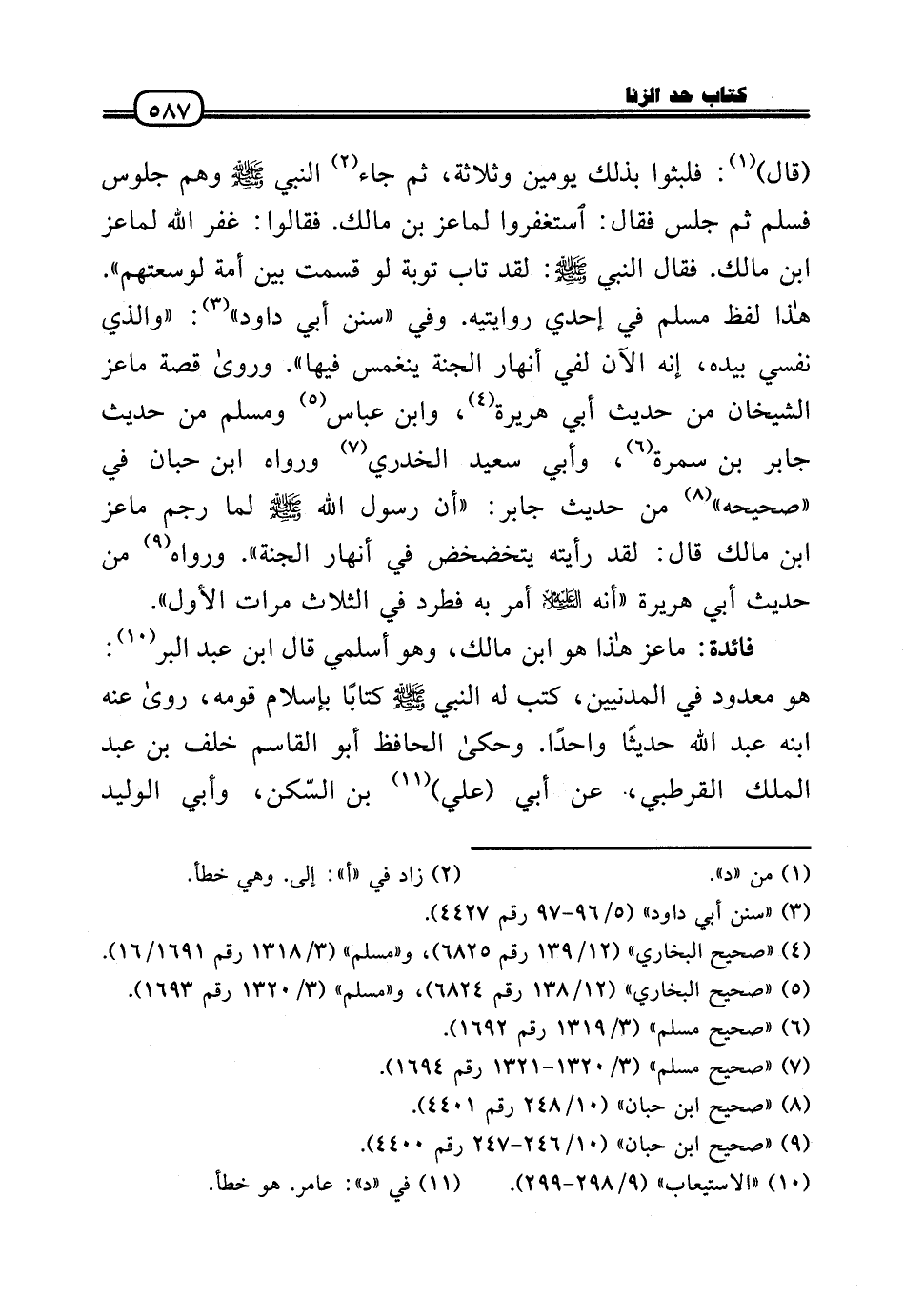 (قَالَ) : فلبثوا بذلك يَوْمَيْنِ وَثَلَاثَة، ثمَّ جَاءَ النَّبِي - صَلَّى الله عَلَيْهِ وَسلم - وهم جُلُوس فَسلم ثمَّ جلس فَقَالَ: اسْتَغْفرُوا لماعز بن مَالك. فَقَالُوا: غفر الله لماعز بن مَالك. فَقَالَ النَّبِي - صَلَّى الله عَلَيْهِ وَسلم -: لقد تَابَ تَوْبَة لَو قسمت بَين أمة لوسعتهم» . هَذَا لفظ مُسلم فِي إحدي روايتيه. وَفِي «سنَن أبي دَاوُد» : «وَالَّذِي نَفسِي بِيَدِهِ، إِنَّه الْآن لفي أَنهَار الْجنَّة ينغمس فِيهَا» . وَرَوَى قصَّة مَاعِز الشَّيْخَانِ من حَدِيث أبي هُرَيْرَة، وَابْن عَبَّاس وَمُسلم من حَدِيث جَابر بن سَمُرَة، وَأبي سعيد الْخُدْرِيّ وَرَوَاهُ ابْن حبَان فِي «صَحِيحه» من حَدِيث جَابر: «أَن رَسُول الله - صَلَّى الله عَلَيْهِ وَسلم - لما رجم مَاعِز بن مَالك قَالَ: لقد رَأَيْته يتخضخض فِي أَنهَار الْجنَّة» . وَرَوَاهُ من حَدِيث أبي هُرَيْرَة «أَنه عَلَيْهِ السَّلَام أَمر بِهِ فطرد فِي الثَّلَاث مَرَّات الأول» .