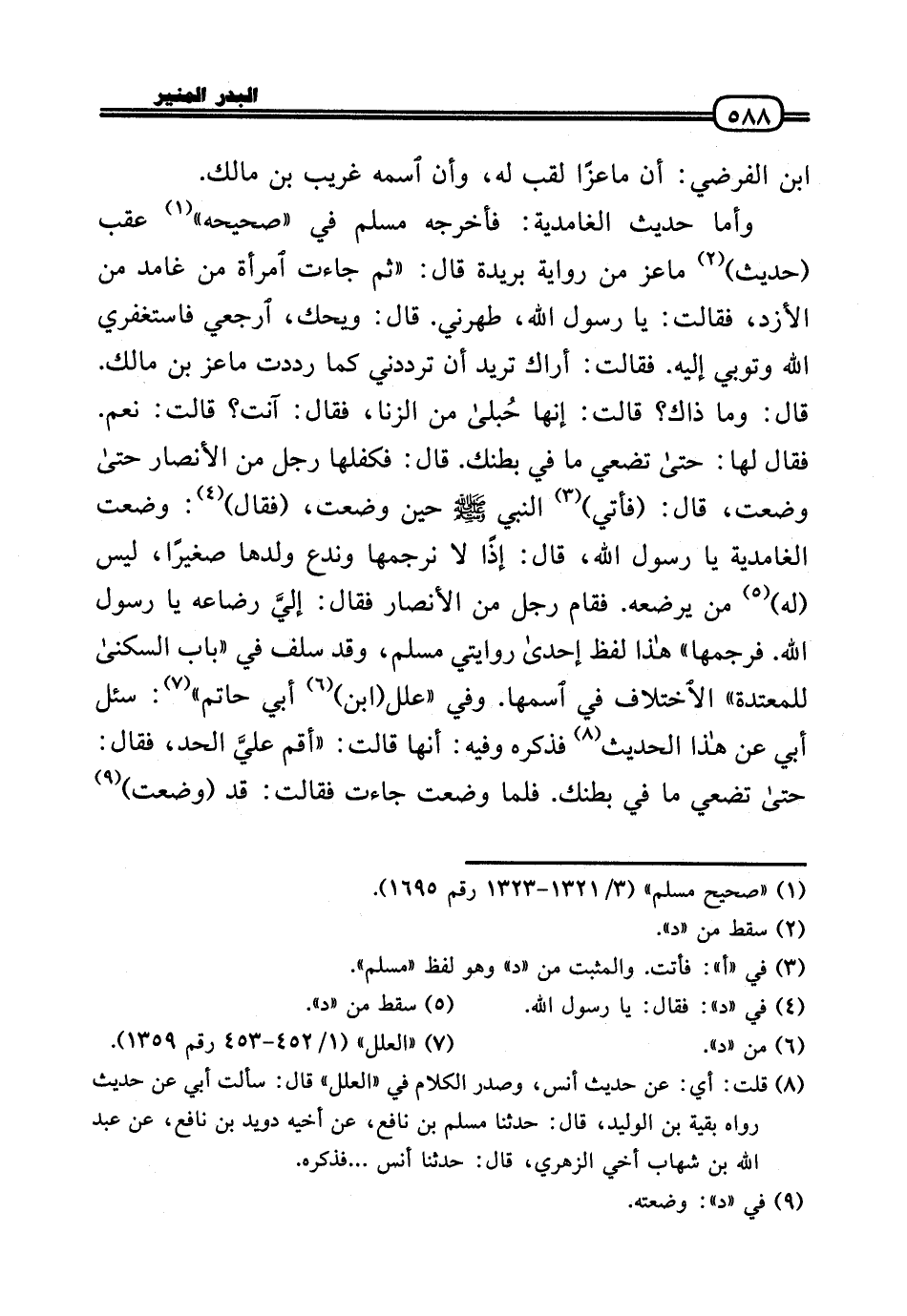 وَأما حَدِيث الغامدية: فَأخْرجهُ مُسلم فِي «صَحِيحه» عقب (حَدِيث) مَاعِز من رِوَايَة بُرَيْدَة قَالَ: «ثمَّ جَاءَت امْرَأَة من غامد من الأزد، فَقَالَت: يَا رَسُول الله، طهرني. قَالَ: وَيحك، ارجعي فاستغفري الله وتوبي إِلَيْهِ. فَقَالَت: أَرَاك تُرِيدُ أَن ترددني كَمَا رددت مَاعِز بن مَالك. قَالَ: وَمَا ذَاك؟ قَالَت: إِنَّهَا حُبلى من الزِّنَا، فَقَالَ: آنت؟ قَالَت: نعم. فَقَالَ لَهَا: حَتَّى تَضَعِي مَا فِي بَطْنك. قَالَ: فكفلها رجل من الْأَنْصَار حَتَّى وضعت، قَالَ: (فَأتي) النَّبِي - صَلَّى الله عَلَيْهِ وَسلم - حِين وضعت، (فَقَالَ) : وضعت الغامدية يَا رَسُول الله، قَالَ: إِذا لَا نرجمها وَنَدع وَلَدهَا صَغِيرا، لَيْسَ (لَهُ) من يرضعه. فَقَامَ رجل من الْأَنْصَار فَقَالَ: إليَّ رضاعه يَا رَسُول الله. فرجمها» هَذَا لفظ إِحْدَى روايتي مُسلم، وَقد سلف فِي «بَاب السُّكْنَى للمعتدة» الِاخْتِلَاف فِي اسْمهَا. وَفِي «علل (ابْن) أبي حَاتِم» : سُئِلَ أبي عَن هَذَا الحَدِيث فَذكره وَفِيه: أَنَّهَا قَالَت: «أقِم عليَّ الْحَد، فَقَالَ: حَتَّى تَضَعِي مَا فِي بَطْنك. فَلَمَّا وضعت جَاءَت فَقَالَت: قد (وضعت)