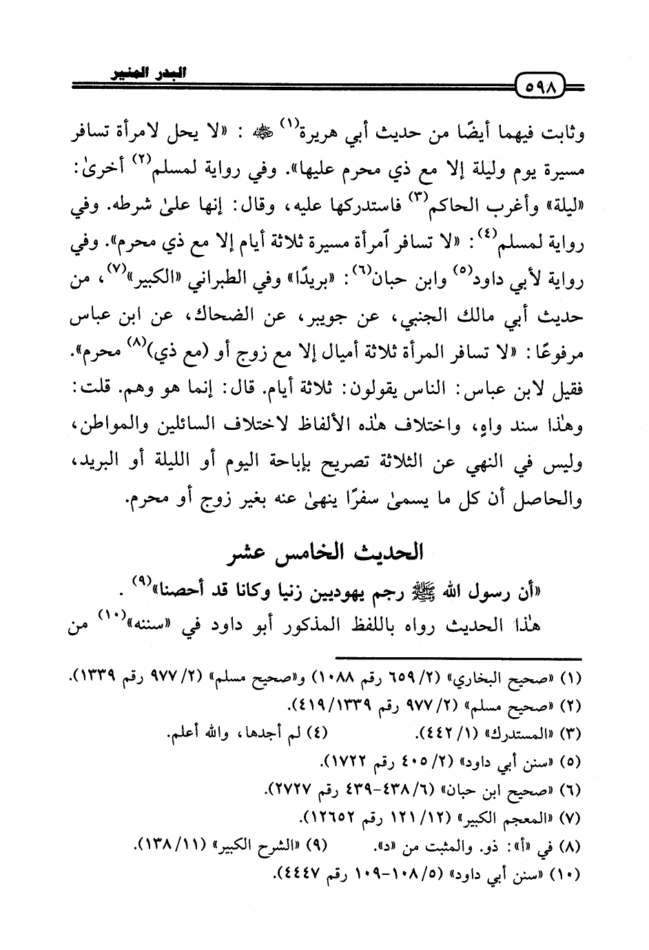 وثابت فيهمَا أَيْضا من حَدِيث أبي هُرَيْرَة رَضِيَ اللَّهُ عَنْه: «لَا يحل لامْرَأَة تُسَافِر مسيرَة يَوْم وَلَيْلَة إِلَّا مَعَ ذِي محرم عَلَيْهَا» . وَفِي رِوَايَة لمُسلم أُخْرَى: «لَيْلَة» وَأغْرب الْحَاكِم فاستدركها عَلَيْهِ، وَقَالَ: إِنَّهَا عَلَى شَرطه. وَفِي رِوَايَة لمُسلم: «لَا تُسَافِر امْرَأَة مسيرَة ثَلَاثَة أَيَّام إِلَّا مَعَ ذِي محرم» . وَفِي رِوَايَة لأبي دَاوُد وَابْن حبَان: «بريدًا» وَفِي الطَّبَرَانِيّ «الْكَبِير» ، من حَدِيث أبي مَالك الْجَنبي، عَن جُوَيْبِر، عَن الضَّحَّاك، عَن ابْن عَبَّاس مَرْفُوعا: «لَا تُسَافِر الْمَرْأَة ثَلَاثَة أَمْيَال إِلَّا مَعَ زوج أَو (مَعَ ذِي) محرم» . فَقيل لِابْنِ عَبَّاس: النَّاس يَقُولُونَ: ثَلَاثَة أَيَّام. قَالَ: إِنَّمَا هُوَ وهم. قلت: وَهَذَا سَنَد واهٍ، وَاخْتِلَاف هَذِه الْأَلْفَاظ لاخْتِلَاف السَّائِلين والمواطن، وَلَيْسَ فِي النَّهْي عَن الثَّلَاثَة تَصْرِيح بِإِبَاحَة الْيَوْم أَو اللَّيْلَة أَو الْبَرِيد، وَالْحَاصِل أَن كل مَا يُسمى سفرا ينْهَى عَنهُ بِغَيْر زوج أَو محرم.