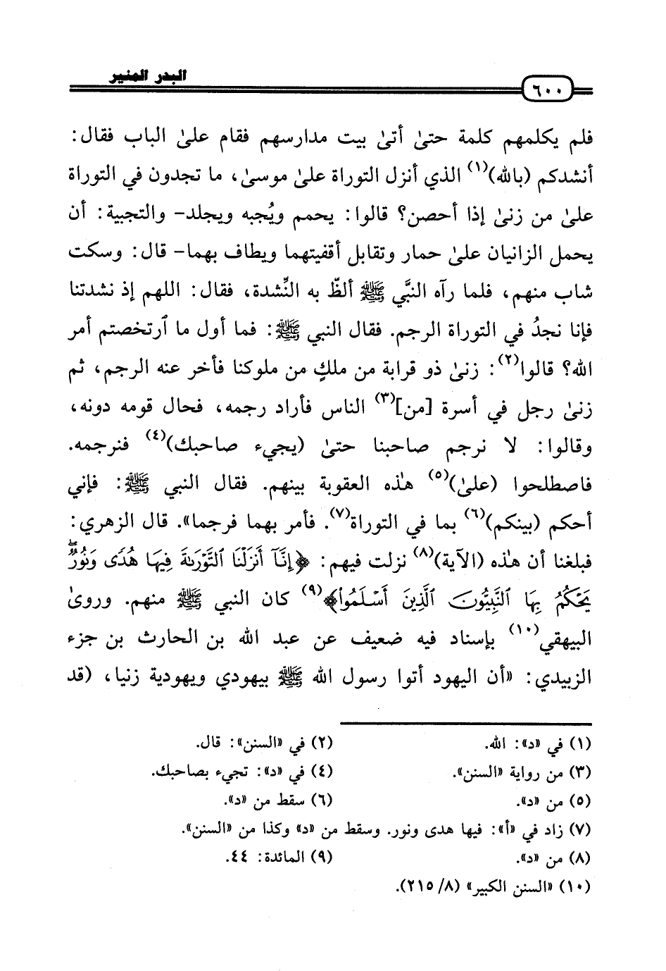 ؟ فَلم يكلمهم كلمة حَتَّى أَتَى بَيت مدارسهم فَقَامَ عَلَى الْبَاب فَقَالَ: أنْشدكُمْ (بِاللَّه) الَّذِي أنزل التَّوْرَاة عَلَى مُوسَى، مَا تَجِدُونَ فِي التَّوْرَاة عَلَى من زنَى إِذا أحصن؟ قَالُوا: يحمم ويُجبه ويجلد - وَالتَّجْبِيَة: أَن يحمل الزانيان عَلَى حمَار وتقابل أقفيتهما وَيُطَاف بهما - قَالَ: وَسكت شَاب مِنْهُم، فَلَمَّا رَآهُ النَّبِي - صَلَّى الله عَلَيْهِ وَسلم - ألظّ بِهِ النِّشدة، فَقَالَ: اللَّهُمَّ إِذْ نَشَدتنَا فَإنَّا نجدُ فِي التَّوْرَاة الرَّجْم. فَقَالَ النَّبِي - صَلَّى الله عَلَيْهِ وَسلم -: فَمَا أول مَا ارتخصتم أَمر الله؟ قَالُوا: زنَى ذُو قرَابَة من ملكٍ من مُلُوكنَا فَأخر عَنهُ الرَّجْم، ثمَّ زنَى رجل فِي أسرة [من] النَّاس فَأَرَادَ رجمه، فحال قومه دونه، وَقَالُوا: لَا نرجم صاحبنا حَتَّى (يَجِيء صَاحبك) فنرجمه. فَاصْطَلَحُوا (عَلَى) هَذِه الْعقُوبَة بَينهم. فَقَالَ النَّبِي - صَلَّى الله عَلَيْهِ وَسلم -: فَإِنِّي أحكم (بَيْنكُم) بِمَا فِي التَّوْرَاة. فَأمر بهما فَرُجِمَا» . قَالَ الزُّهْرِيّ: فَبَلغنَا أَن هَذِه (الْآيَة) نزلت فيهم: (إِنَّا أنزلنَا التَّوْرَاة فِيهَا هُدى وَنور يحكمُ بهَا النَّبِيُّونَ الَّذين أَسْلمُوا) كَانَ النَّبِي - صَلَّى الله عَلَيْهِ وَسلم - مِنْهُم. وَرَوَى الْبَيْهَقِيّ بِإِسْنَاد فِيهِ ضَعِيف عَن عبد الله بن الْحَارِث بن جُزْء الزبيدِيّ: «أَن الْيَهُود أَتَوا رَسُول الله - صَلَّى الله عَلَيْهِ وَسلم - بِيَهُودِيٍّ وَيَهُودِيَّة زَنَيَا، (قد