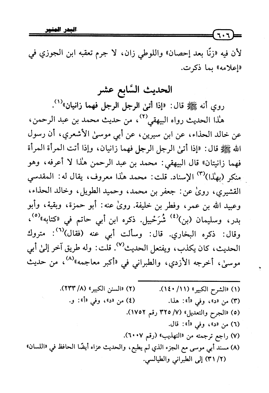 هَذَا الحَدِيث رَوَاهُ الْبَيْهَقِيّ، من حَدِيث مُحَمَّد بن عبد الرَّحْمَن، عَن خَالِد الْحذاء، عَن ابْن سِيرِين، عَن أبي مُوسَى الْأَشْعَرِيّ، أَن رَسُول الله - صَلَّى الله عَلَيْهِ وَسلم - قَالَ: «إِذا أَتَى الرجل الرجل فهما زانيان، وَإِذا أَتَت الْمَرْأَة الْمَرْأَة فهما زانيتان» قَالَ الْبَيْهَقِيّ: مُحَمَّد بن عبد الرَّحْمَن هَذَا لَا أعرفهُ، وَهُوَ مُنكر (بِهَذَا) الْإِسْنَاد. قلت: مُحَمَّد هَذَا مَعْرُوف، يُقَال لَهُ: الْمَقْدِسِي الْقشيرِي، رَوَى عَن: جَعْفَر بن مُحَمَّد، وَحميد الطَّوِيل، وخَالِد الْحذاء، وَعبيد الله بن عمر، وَفطر بن خَليفَة. رَوَى عَنهُ: أَبُو حَمْزَة، وَبَقِيَّة، وَأَبُو بدر، وَسليمَان (بن) شُرَحْبيل. ذكره ابْن أبي حَاتِم فِي «كِتَابه» ، وَقَالَ: ذكره البُخَارِيّ. قَالَ: وَسَأَلت أبي عَنهُ (فَقَالَ) : مَتْرُوك الحَدِيث، كَانَ يكذب، ويفتعل الحَدِيث. قلت: وَله طَرِيق آخر إِلَى أبي مُوسَى، أخرجه الْأَزْدِيّ، وَالطَّبَرَانِيّ فِي «أكبر معاجمه» ، من حَدِيث