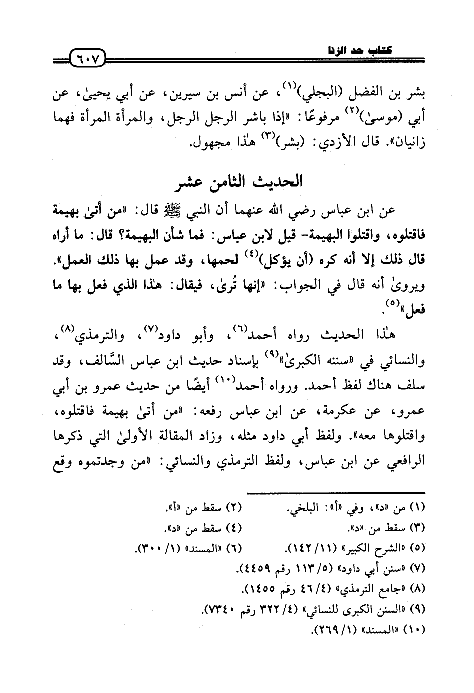 عَن ابْن عَبَّاس رَضِيَ اللَّهُ عَنْهما أَن النَّبِي - صَلَّى الله عَلَيْهِ وَسلم - قَالَ: «من أَتَى بَهِيمَة فَاقْتُلُوهُ، واقتلوا الْبَهِيمَة - قيل لِابْنِ عَبَّاس: فَمَا شَأْن الْبَهِيمَة؟ قَالَ: مَا أرَاهُ قَالَ ذَلِك إِلَّا أَنه كره (أَن يُؤْكَل) لَحمهَا، وَقد عمل بهَا ذَلِك الْعَمَل» . وَيروَى أَنه قَالَ فِي الْجَواب: «إِنَّهَا تُرى، فَيُقَال: هَذَا الَّذِي فعل بهَا مَا فعل» .