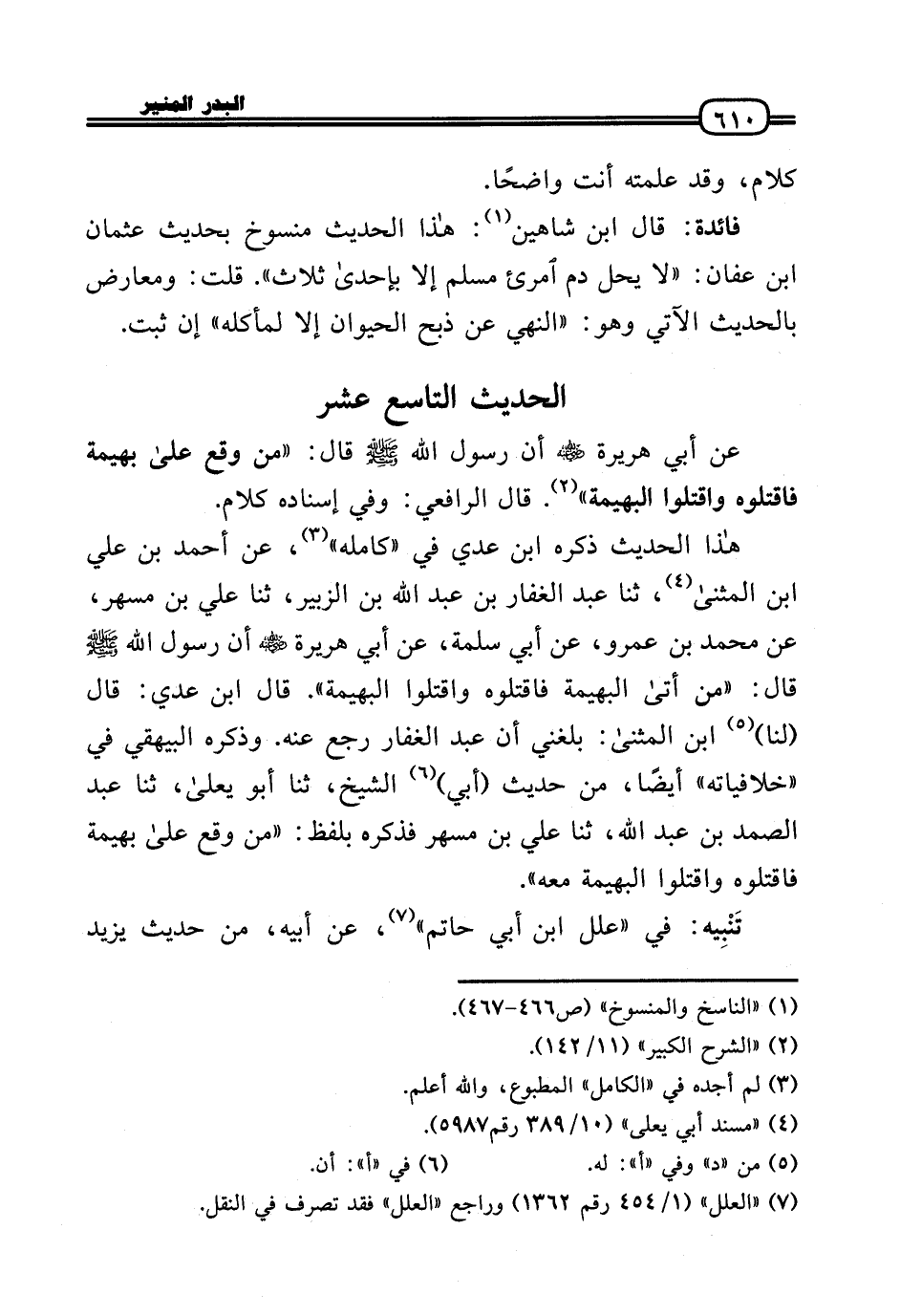 هَذَا الحَدِيث ذكره ابْن عدي فِي «كَامِله» ، عَن أَحْمد بن عَلّي بن الْمثنى، ثَنَا عبد الْغفار بن عبد الله بن الزبير، ثَنَا عَلّي بن مسْهر، عَن مُحَمَّد بن عَمْرو، عَن أبي سَلمَة، عَن أبي هُرَيْرَة رَضِيَ اللَّهُ عَنْه أَن رَسُول الله - صَلَّى الله عَلَيْهِ وَسلم - قَالَ: «من أَتَى الْبَهِيمَة فَاقْتُلُوهُ واقتلوا الْبَهِيمَة» . قَالَ ابْن عدي: قَالَ (لنا) ابْن الْمثنى: بَلغنِي أَن عبد الْغفار رَجَعَ عَنهُ. وَذكره الْبَيْهَقِيّ فِي «خلافياته» أَيْضا، من حَدِيث (أبي) الشَّيْخ، ثَنَا أَبُو يعْلى، ثَنَا عبد الصَّمد بن عبد الله، ثَنَا عَلّي بن مسْهر فَذكره بِلَفْظ: «من وَقع عَلَى بَهِيمَة فَاقْتُلُوهُ واقتلوا الْبَهِيمَة مَعَه» .