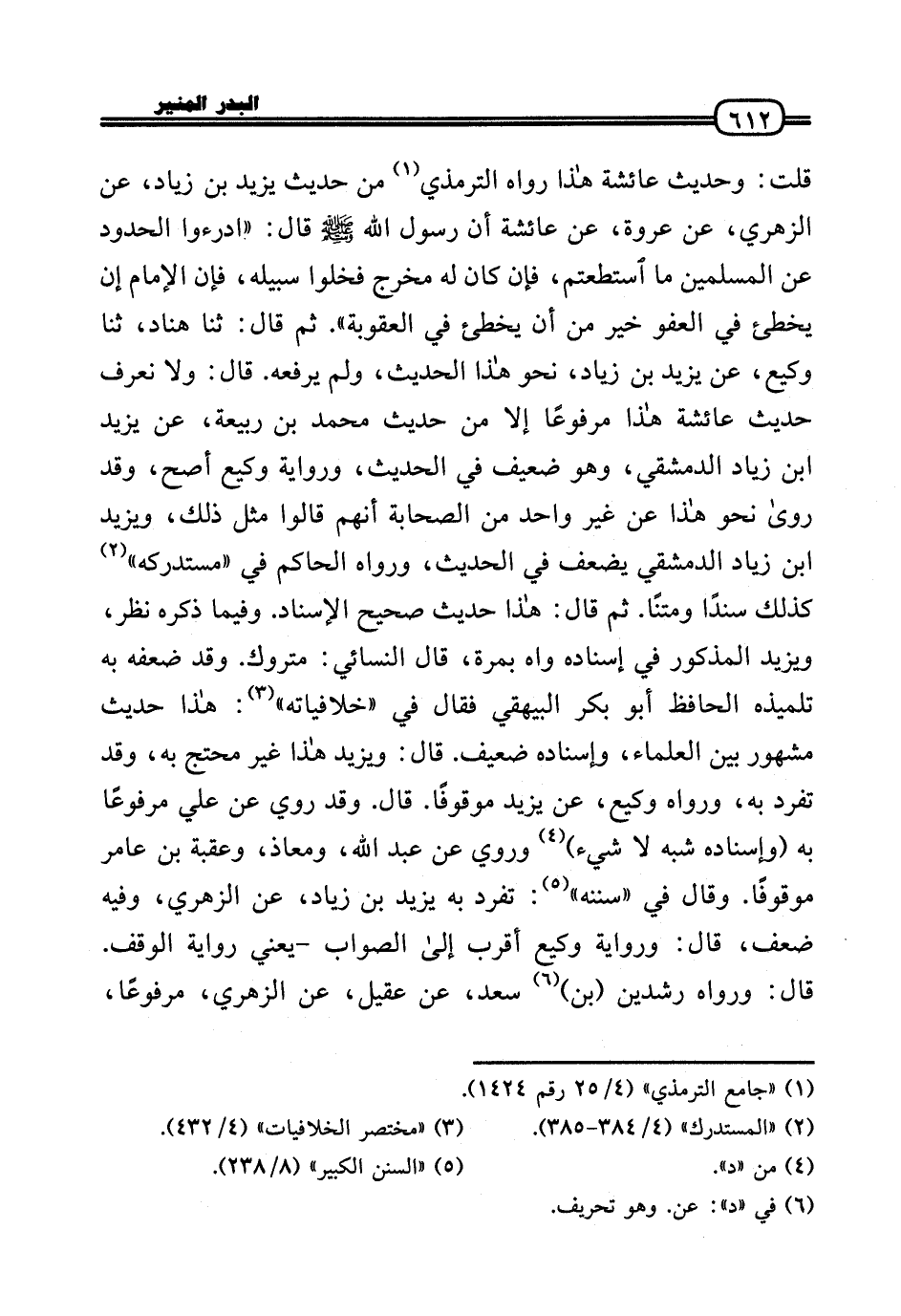 قلت: وَحَدِيث عَائِشَة هَذَا رَوَاهُ التِّرْمِذِيّ من حَدِيث يزِيد بن زِيَاد، عَن الزُّهْرِيّ، عَن عُرْوَة، عَن عَائِشَة أَن رَسُول الله - صَلَّى الله عَلَيْهِ وَسلم - قَالَ: «ادرءوا الْحُدُود عَن الْمُسلمين مَا اسْتَطَعْتُم، فَإِن كَانَ لَهُ مخرج فَخلوا سَبيله، فَإِن الإِمَام إِن يُخطئ فِي الْعَفو خير من أَن يُخطئ فِي الْعقُوبَة» . ثمَّ قَالَ: ثَنَا هناد، ثَنَا وَكِيع، عَن يزِيد بن زِيَاد، نَحْو هَذَا الحَدِيث، وَلم يرفعهُ. قَالَ: وَلَا نَعْرِف حَدِيث عَائِشَة هَذَا مَرْفُوعا إِلَّا من حَدِيث مُحَمَّد بن ربيعَة، عَن يزِيد بن زِيَاد الدِّمَشْقِي، وَهُوَ ضَعِيف فِي الحَدِيث، وَرِوَايَة وَكِيع أصح، وَقد رَوَى نَحْو هَذَا عَن غير وَاحِد من الصَّحَابَة أَنهم قَالُوا مثل ذَلِك، وَيزِيد بن زِيَاد الدِّمَشْقِي يضعف فِي الحَدِيث، وَرَوَاهُ الْحَاكِم فِي «مُسْتَدْركه» كَذَلِك سندًا ومتنًا. ثمَّ قَالَ: هَذَا حَدِيث صَحِيح الْإِسْنَاد. وَفِيمَا ذكره نظر، وَيزِيد الْمَذْكُور فِي إِسْنَاده واه بِمرَّة، قَالَ النَّسَائِيّ: مَتْرُوك. وَقد ضعفه بِهِ تِلْمِيذه الْحَافِظ أَبُو بكر الْبَيْهَقِيّ فَقَالَ فِي «خلافياته» : هَذَا حَدِيث مَشْهُور بَين الْعلمَاء، وَإِسْنَاده ضَعِيف. قَالَ: وَيزِيد هَذَا غير مُحْتَج بِهِ، وَقد تفرد بِهِ، وَرَوَاهُ وَكِيع، عَن يزِيد مَوْقُوفا. قَالَ. وَقد رُوِيَ عَن عَلّي مَرْفُوعا بِهِ (وَإِسْنَاده شبه لَا شَيْء) وَرُوِيَ عَن عبد الله، ومعاذ، وَعقبَة بن عَامر مَوْقُوفا. وَقَالَ فِي «سنَنه» : تفرد بِهِ يزِيد بن زِيَاد، عَن الزُّهْرِيّ، وَفِيه ضعف، قَالَ: وَرِوَايَة وَكِيع أقرب إِلَى الصَّوَاب - يَعْنِي رِوَايَة الْوَقْف. قَالَ: وَرَوَاهُ رشدين (بن) سعد، عَن عقيل، عَن الزُّهْرِيّ، مَرْفُوعا،