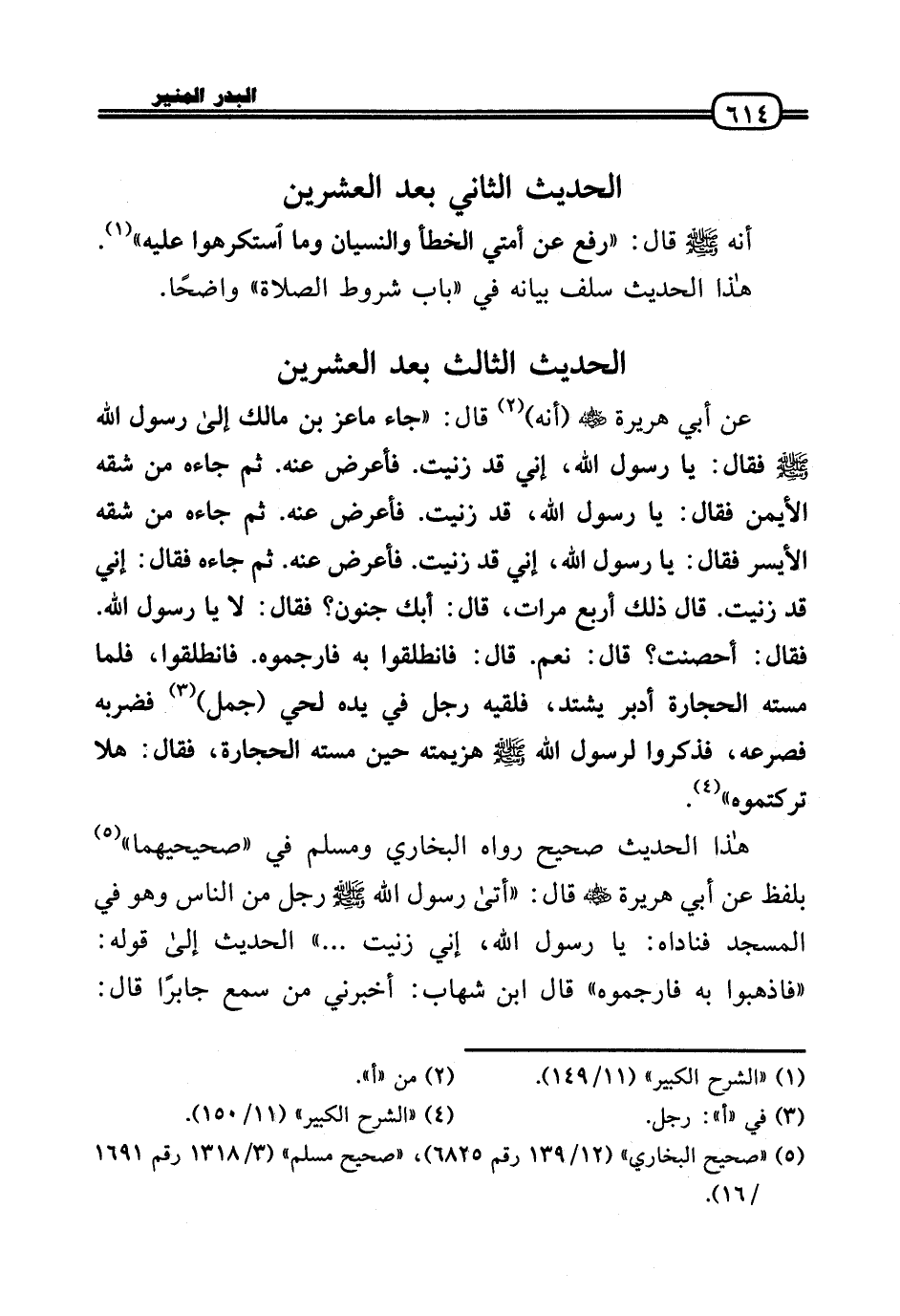 عَن أبي هُرَيْرَة رَضِيَ اللَّهُ عَنْه (أَنه) قَالَ: «جَاءَ مَاعِز بن مَالك إِلَى رَسُول الله - صَلَّى الله عَلَيْهِ وَسلم - فَقَالَ: يَا رَسُول الله، إِنِّي قد زَنَيْت. فَأَعْرض عَنهُ. ثمَّ جَاءَهُ من شقَّه الْأَيْمن فَقَالَ: يَا رَسُول الله، قد زَنَيْت. فَأَعْرض عَنهُ. ثمَّ جَاءَهُ من شقَّه الْأَيْسَر فَقَالَ: يَا رَسُول الله، إِنِّي قد زَنَيْت. فَأَعْرض عَنهُ. ثمَّ جَاءَهُ فَقَالَ: إِنِّي قد زَنَيْت. قَالَ ذَلِك أَربع مَرَّات، قَالَ: أبك جُنُون؟ فَقَالَ: لَا يَا رَسُول الله. فَقَالَ: أحصنت؟ قَالَ: نعم. قَالَ: فَانْطَلقُوا بِهِ فارجموه. فَانْطَلقُوا، فَلَمَّا مسته الْحِجَارَة أدبر يشْتَد، فَلَقِيَهُ رجل فِي يَده لحي (جمل) فَضَربهُ فصرعه، فَذكرُوا لرَسُول الله - صَلَّى الله عَلَيْهِ وَسلم - هزيمته حِين مسته الْحِجَارَة، فَقَالَ: هلا تَرَكْتُمُوهُ» .