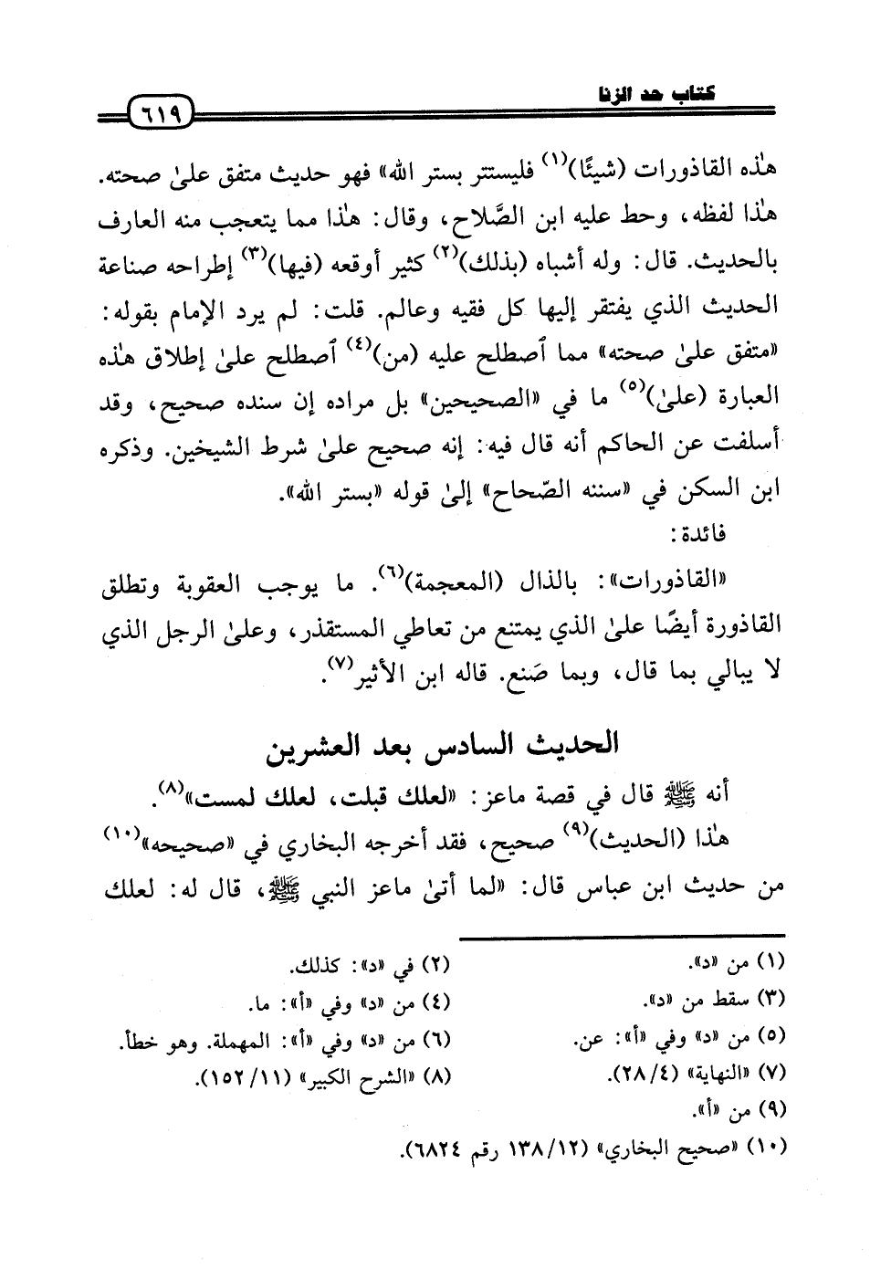 هَذِه القاذورات (شَيْئا) فليستتر بستر الله» فَهُوَ حَدِيث مُتَّفق عَلَى صِحَّته. هَذَا لَفظه، وَحط عَلَيْهِ ابْن الصَّلاح، وَقَالَ: هَذَا مِمَّا يتعجب مِنْهُ الْعَارِف بِالْحَدِيثِ. قَالَ: وَله أشباه (بذلك) كثير أوقعه (فِيهَا) إطراحه صناعَة الحَدِيث الَّذِي يفْتَقر إِلَيْهَا كل فَقِيه وعالم. قلت: لم يرد الإِمَام بقوله: «مُتَّفق عَلَى صِحَّته» مِمَّا اصْطلحَ عَلَيْهِ (من) اصْطلحَ عَلَى إِطْلَاق هَذِه الْعبارَة (عَلَى) مَا فِي «الصَّحِيحَيْنِ» بل مُرَاده إِن سَنَده صَحِيح، وَقد أسلفت عَن الْحَاكِم أَنه قَالَ فِيهِ: إِنَّه صَحِيح عَلَى شَرط الشَّيْخَيْنِ. وَذكره ابْن السكن فِي «سنَنه الصّحاح» إِلَى قَوْله «بستر الله» .