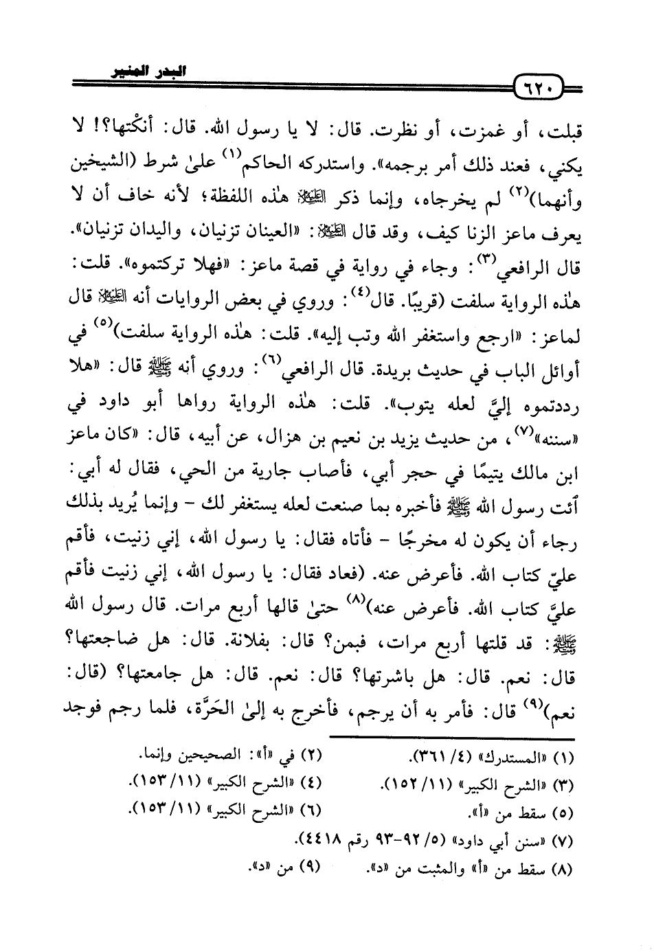 قبلت، أَو غمزت، أَو نظرت. قَالَ: لَا يَا رَسُول الله. قَالَ: أنكْتها؟ ! لَا يكني، فَعِنْدَ ذَلِك أَمر برجمه» . واستدركه الْحَاكِم عَلَى شَرط (الشَّيْخَيْنِ وأنهما) لم يخرجَاهُ، وَإِنَّمَا ذكر عَلَيْهِ السَّلَام هَذِه اللَّفْظَة؛ لِأَنَّهُ خَافَ أَن لَا يعرف مَاعِز الزِّنَا كَيفَ، وَقد قَالَ عَلَيْهِ السَّلَام: «العينان تزنيان، وَالْيَدَانِ تزنيان» . قَالَ الرَّافِعِيّ: وَجَاء فِي رِوَايَة فِي قصَّة مَاعِز: «فَهَلا تَرَكْتُمُوهُ» . قلت: هَذِه الرِّوَايَة سلفت (قَرِيبا. قَالَ: وَرُوِيَ فِي بعض الرِّوَايَات أَنه عَلَيْهِ السَّلَام قَالَ لماعز: «ارْجع واستغفر الله وَتب إِلَيْهِ» . قلت: هَذِه الرِّوَايَة سلفت) فِي أَوَائِل الْبَاب فِي حَدِيث بُرَيْدَة. قَالَ الرَّافِعِيّ: وَرُوِيَ أنَّه - صَلَّى الله عَلَيْهِ وَسلم - قَالَ: «هلا رددتموه إليَّ لَعَلَّه يَتُوب» . قلت: هَذِه الرِّوَايَة رَوَاهَا أَبُو دَاوُد فِي «سنَنه» ، من حَدِيث يزِيد بن نعيم بن هزال، عَن أَبِيه، قَالَ: «كَانَ مَاعِز بن مَالك يَتِيما فِي حجر أبي، فَأصَاب جَارِيَة من الْحَيّ، فَقَالَ لَهُ أبي: ائْتِ رَسُول الله - صَلَّى الله عَلَيْهِ وَسلم - فَأخْبرهُ بِمَا صنعت لَعَلَّه يسْتَغْفر لَك - وَإِنَّمَا يُريد بذلك رَجَاء أَن يكون لَهُ مخرجا - فَأَتَاهُ فَقَالَ: يَا رَسُول الله، إِنِّي زَنَيْت، فأقم عليّ كتاب الله. فَأَعْرض عَنهُ. (فَعَاد فَقَالَ: يَا رَسُول الله، إِنِّي زَنَيْت فأقم عليَّ كتاب الله. فَأَعْرض عَنهُ) حَتَّى قَالَهَا أَربع مَرَّات. قَالَ رَسُول الله - صَلَّى الله عَلَيْهِ وَسلم -: قد قلتهَا أَربع مَرَّات، فبمن؟ قَالَ: بفلانة. قَالَ: هَل ضاجعتها؟ قَالَ: نعم. قَالَ: هَل باشرتها؟ قَالَ: نعم. قَالَ: هَل جامعتها؟ (قَالَ: نعم) قَالَ: فَأمر بِهِ أَن يرْجم، فَأخْرج بِهِ إِلَى الحَرَّة، فَلَمَّا رجم فَوجدَ