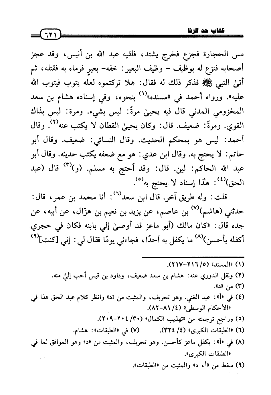 مس الْحِجَارَة فجزع فَخرج يشْتَد، فَلَقِيَهُ عبد الله بن أنيس، وَقد عجز أَصْحَابه فَنزع لَهُ بوظيف - وظيف الْبَعِير: خفه - بعيرٍ فَرَمَاهُ بِهِ فَقتله، ثمَّ أَتَى النَّبِي - صَلَّى الله عَلَيْهِ وَسلم - فَذكر ذَلِك لَهُ فَقَالَ: هلا تَرَكْتُمُوهُ لَعَلَّه يَتُوب فيتوب الله عَلَيْهِ» . وَرَوَاهُ أَحْمد فِي «مُسْنده» بِنَحْوِهِ، وَفِي إِسْنَاده هِشَام بن سعد المَخْزُومِي الْمدنِي قَالَ فِيهِ يَحْيَى مرّة: لَيْسَ بِشَيْء. وَمرَّة: لَيْسَ بِذَاكَ الْقوي. وَمرَّة: ضَعِيف. قَالَ: وَكَانَ يَحْيَى الْقطَّان لَا يكْتب عَنهُ. وَقَالَ أَحْمد: لَيْسَ هُوَ بمحكم الحَدِيث. وَقَالَ النَّسَائِيّ: ضَعِيف. وَقَالَ أَبُو حَاتِم: لَا يحْتَج بِهِ. وَقَالَ ابْن عدي: هُوَ مَعَ ضعفه يكْتب حَدِيثه. وَقَالَ أَبُو عبد الله الْحَاكِم: لين. قَالَ: وَقد احْتج بِهِ مُسلم. (و) قَالَ (عبد الْحق) : هَذَا إِسْنَاد لَا يحْتَج بِهِ.