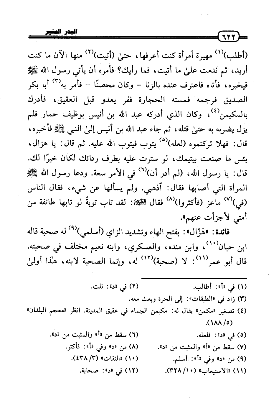 (أطلب) مهيرة امْرَأَة كنت أعرفهَا، حَتَّى (أتيت) مِنْهَا الْآن مَا كنت أُرِيد، ثمَّ نَدِمت عَلَى مَا أتيت، فَمَا رَأْيك؟ فَأمره أَن يَأْتِي رَسُول الله - صَلَّى الله عَلَيْهِ وَسلم - فيخبره، فَأَتَاهُ فاعترف عِنْده بِالزِّنَا - وَكَانَ مُحصنا - فَأمر بِهِ أَبَا بكر الصّديق فرجمه فمسته الْحِجَارَة ففر يعدو قبل العقيق، فَأدْرك بالمكيمن، وَكَانَ الَّذِي أدْركهُ عبد الله بن أنيس بوظيف حمَار فَلم يزل يضْربهُ بِهِ حَتَّى قَتله، ثمَّ جَاءَ عبد الله بن أنيس إِلَى النَّبِي - صَلَّى الله عَلَيْهِ وَسلم - فَأخْبرهُ، قَالَ: فَهَلا تَرَكْتُمُوهُ (لَعَلَّه) يَتُوب فيتوب الله عَلَيْهِ. ثمَّ قَالَ: يَا هزال، بئس مَا صنعت بيتيمك، لَو سترت عَلَيْهِ بِطرف ردائك لَكَانَ خيرا لَك. قَالَ: يَا رَسُول الله، (لم أدر أَن) فِي الْأَمر سَعَة. ودعا رَسُول الله - صَلَّى الله عَلَيْهِ وَسلم - الْمَرْأَة الَّتِي أَصَابَهَا فَقَالَ: اذهبي. وَلم يسْأَلهَا عَن شَيْء، فَقَالَ النَّاس (فِي) مَاعِز (فَأَكْثرُوا) فَقَالَ عَلَيْهِ السَّلَام: لقد تَابَ تَوْبَة لَو تابها طَائِفَة من أمتِي لأجزأت عَنْهُم» .