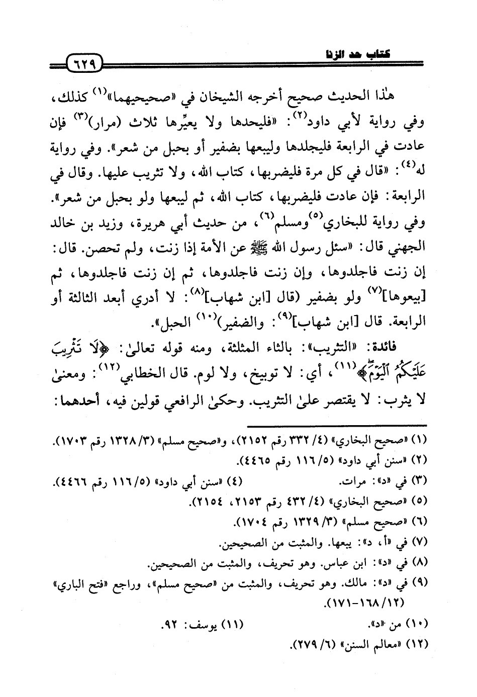 هَذَا الحَدِيث صَحِيح أخرجه الشَّيْخَانِ فِي «صَحِيحَيْهِمَا» كَذَلِك، وَفِي رِوَايَة لأبي دَاوُد: «فليحدها وَلَا يعيِّرها ثَلَاث (مرار) فَإِن عَادَتْ فِي الرَّابِعَة فليجلدها وليبعها بضفير أَو بِحَبل من شعر» . وَفِي رِوَايَة لَهُ: «قَالَ فِي كل مرّة فليضربها، كتاب الله، وَلَا تَثْرِيب عَلَيْهَا. وَقَالَ فِي الرَّابِعَة: فَإِن عَادَتْ فليضربها، كتاب الله، ثمَّ ليبعها وَلَو بِحَبل من شعر» . وَفِي رِوَايَة للْبُخَارِيّ وَمُسلم، من حَدِيث أبي هُرَيْرَة، وَزيد بن خَالِد الْجُهَنِيّ قَالَ: «سُئِلَ رَسُول الله - صَلَّى الله عَلَيْهِ وَسلم - عَن الْأمة إِذا زنت، وَلم تحصن. قَالَ: إِن زنت فاجلدوها، وَإِن زنت فاجلدوها، ثمَّ إِن زنت فاجلدوها، ثمَّ [بيعوها] وَلَو بضفير (قَالَ [ابْن شهَاب] : لَا أَدْرِي أبعد الثَّالِثَة أَو الرَّابِعَة. قَالَ [ابْن شهَاب] : والضفير) الْحَبل» .