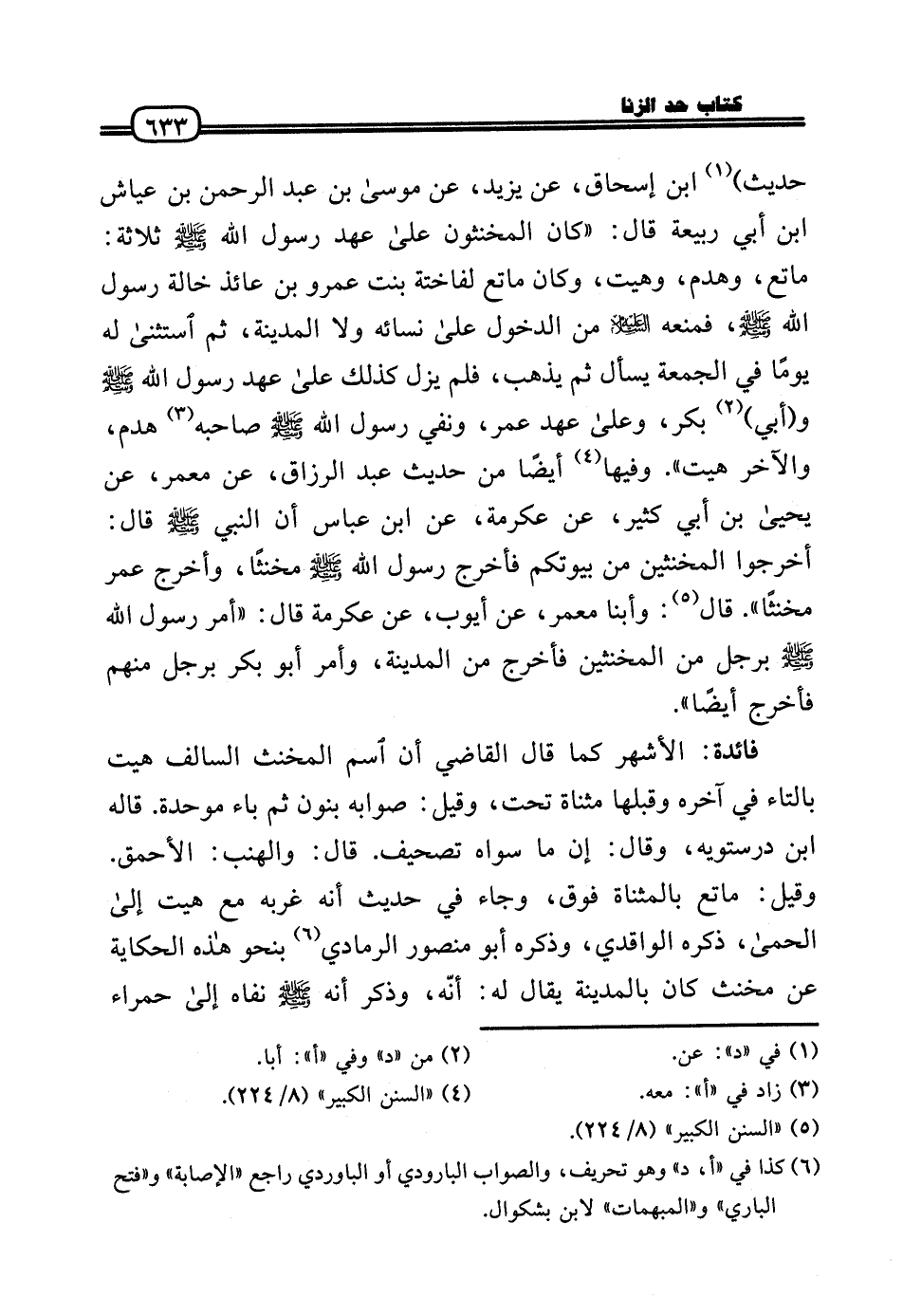 حَدِيث) ابْن إِسْحَاق، عَن يزِيد، عَن مُوسَى بن عبد الرَّحْمَن بن عَيَّاش بن أبي ربيعَة قَالَ: «كَانَ المخنثون عَلَى عهد رَسُول الله - صَلَّى الله عَلَيْهِ وَسلم - ثَلَاثَة: ماتع، وَهدم، وهيت، وَكَانَ ماتع لفاختة بنت عَمْرو بن عَائِذ خَالَة رَسُول الله - صَلَّى الله عَلَيْهِ وَسلم -، فَمَنعه عَلَيْهِ السَّلَام من الدُّخُول عَلَى نِسَائِهِ وَلَا الْمَدِينَة، ثمَّ اسْتثْنى لَهُ يَوْمًا فِي الْجُمُعَة يسْأَل ثمَّ يذهب، فَلم يزل كَذَلِك عَلَى عهد رَسُول الله - صَلَّى الله عَلَيْهِ وَسلم - و (أبي) بكر، وَعَلَى عهد عمر، وَنفي رَسُول الله - صَلَّى الله عَلَيْهِ وَسلم - صَاحبه هدم، وَالْآخر هيت» . وفيهَا أَيْضا من حَدِيث عبد الرَّزَّاق، عَن معمر، عَن يَحْيَى بن أبي كثير، عَن عِكْرِمَة، عَن ابْن عَبَّاس أَن النَّبِي - صَلَّى الله عَلَيْهِ وَسلم - قَالَ: أخرجُوا المخنثين من بُيُوتكُمْ فَأخْرج رَسُول الله - صَلَّى الله عَلَيْهِ وَسلم - مخنثًا، وَأخرج عمر مخنثًا» . قَالَ: وأبنا معمر، عَن أَيُّوب، عَن عِكْرِمَة قَالَ: «أَمر رَسُول الله - صَلَّى الله عَلَيْهِ وَسلم - بِرَجُل من المخنثين فَأخْرج من الْمَدِينَة، وَأمر أَبُو بكر بِرَجُل مِنْهُم فَأخْرج أَيْضا» .