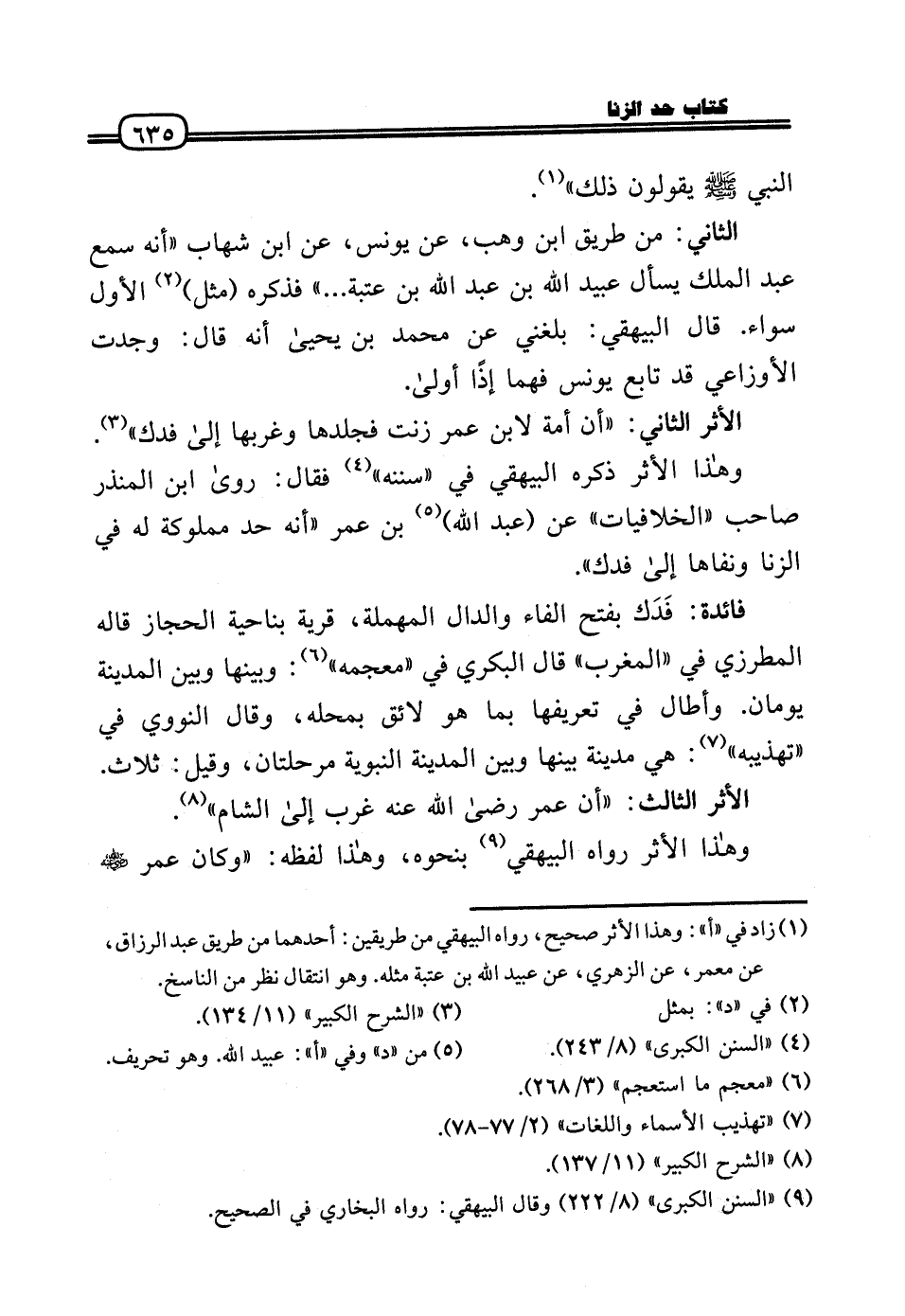 وَهَذَا الْأَثر ذكره الْبَيْهَقِيّ فِي «سنَنه» فَقَالَ: رَوَى ابْن الْمُنْذر صَاحب «الخلافيات» عَن (عبد الله) بن عمر «أَنه حد مَمْلُوكَة لَهُ فِي الزِّنَا ونفاها إِلَى فدك» .