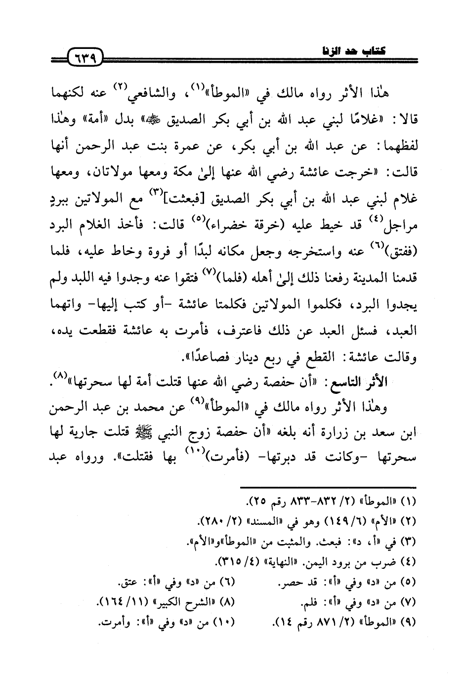 هَذَا الْأَثر رَوَاهُ مَالك فِي «الْمُوَطَّأ» ، وَالشَّافِعِيّ عَنهُ لكنهما قَالَا: «غُلَاما لبني عبد الله بن أبي بكر الصّديق رَضِيَ اللَّهُ عَنْه» بدل «أمة» وَهَذَا لَفْظهمَا: عَن عبد الله بن أبي بكر، عَن عمْرَة بنت عبد الرَّحْمَن أَنَّهَا قَالَت: «خرجت عَائِشَة رَضِيَ اللَّهُ عَنْها إِلَى مَكَّة وَمَعَهَا مولاتان، وَمَعَهَا غُلَام لبني عبد الله بن أبي بكر الصّديق [فَبعثت] مَعَ المولاتين ببردٍ مراجل قد خيط عَلَيْهِ (خرقَة خضراء) قَالَت: فَأخذ الْغُلَام الْبرد (ففتق) عَنهُ واستخرجه وَجعل مَكَانَهُ لبدًا أَو فَرْوَة وخاط عَلَيْهِ، فَلَمَّا قدمنَا الْمَدِينَة رفعنَا ذَلِك إِلَى أَهله (فَلَمَّا) فتقوا عَنهُ وجدوا فِيهِ اللبد وَلم يَجدوا الْبرد، فَكَلَّمُوا المولاتين فكلمتا عَائِشَة - أَو كتب إِلَيْهَا - واتهما العَبْد، فَسئلَ العَبْد عَن ذَلِك فاعترف، فَأمرت بِهِ عَائِشَة فَقطعت يَده، وَقَالَت عَائِشَة: الْقطع فِي ربع دِينَار فَصَاعِدا» .