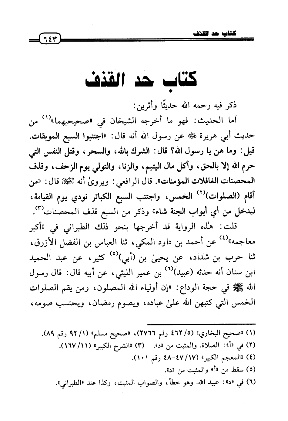 أما الحَدِيث: فَهُوَ مَا أخرجه الشَّيْخَانِ فِي «صَحِيحَيْهِمَا» من حَدِيث أبي هُرَيْرَة رَضِيَ اللَّهُ عَنْه عَن رَسُول الله أَنه قَالَ: «اجتنبوا السَّبع الموبقات. قيل: وَمَا هن يَا رَسُول الله؟ قَالَ: الشّرك بِاللَّه، وَالسحر، وَقتل النَّفس الَّتِي حرم الله إِلَّا بِالْحَقِّ، وَأكل مَال الْيَتِيم، وَالزِّنَا، والتولي يَوْم الزَّحْف، وَقذف الْمُحْصنَات الْغَافِلَات الْمُؤْمِنَات» . قَالَ الرَّافِعِيّ: وَيروَى أَنه عَلَيْهِ السَّلَام قَالَ: «من أَقَامَ (الصَّلَوَات) الْخمس، واجتنب السَّبع الْكَبَائِر نُودي يَوْم الْقِيَامَة، ليدْخل من أَي أَبْوَاب الْجنَّة شَاءَ» وَذكر من السَّبع قذف الْمُحْصنَات.