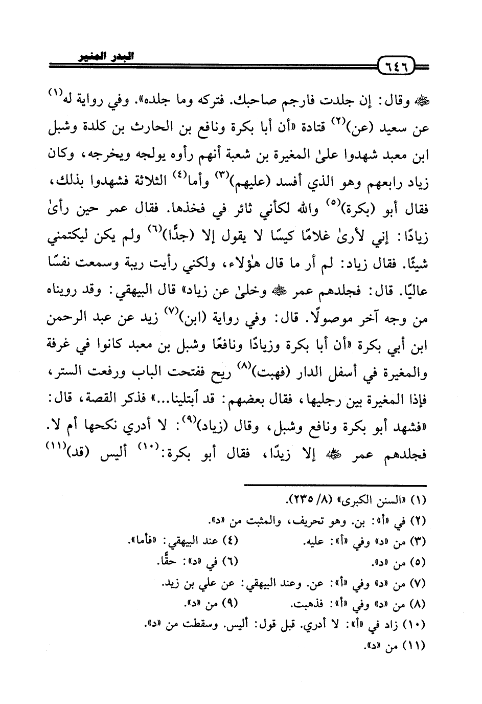 رَضِيَ اللَّهُ عَنْه وَقَالَ: إِن جلدت فارجم صَاحبك. فَتَركه وَمَا جلده» . وَفِي رِوَايَة لَهُ عَن سعيد (عَن) قَتَادَة «أَن أَبَا بكرَة وَنَافِع بن الْحَارِث بن كلدة وشبل بن معبد شهدُوا عَلَى الْمُغيرَة بن شُعْبَة أَنهم رَأَوْهُ يولجه ويخرجه، وَكَانَ زِيَاد رابعهم وَهُوَ الَّذِي أفسد (عَلَيْهِم) وَأما الثَّلَاثَة فَشَهِدُوا بذلك، فَقَالَ أَبُو (بكرَة) وَالله لكَأَنِّي ثَائِر فِي فَخذهَا. فَقَالَ عمر حِين رَأَى زيادًا: إِنِّي لأرَى غُلَاما كيسًا لَا يَقُول إِلَّا (جدًّا) وَلم يكن ليكتمني شَيْئا. فَقَالَ زِيَاد: لم أر مَا قَالَ هَؤُلَاءِ، وَلَكِنِّي رَأَيْت رِيبَة وَسمعت نفسا عَالِيا. قَالَ: فجلدهم عمر رَضِيَ اللَّهُ عَنْه وخلى عَن زِيَاد» قَالَ الْبَيْهَقِيّ: وَقد رَوَيْنَاهُ من وَجه آخر مَوْصُولا. قَالَ: وَفِي رِوَايَة (ابْن) زيد عَن عبد الرَّحْمَن بن أبي بكرَة «أَن أَبَا بكرَة وزيادًا ونافعًا وشبل بن معبد كَانُوا فِي غرفَة والمغيرة فِي أَسْفَل الدَّار (فَهبت) ريح ففتحت الْبَاب وَرفعت السّتْر، فَإِذا الْمُغيرَة بَين رِجْلَيْهَا، فَقَالَ بَعضهم: قد ابتلينا ... » فَذكر الْقِصَّة، قَالَ: «فَشهد أَبُو بكرَة وَنَافِع وشبل، وَقَالَ (زِيَاد) : لَا أَدْرِي نَكَحَهَا أم لَا. فجلدهم عمر رَضِيَ اللَّهُ عَنْه إِلَّا زيدا، فَقَالَ أَبُو بكرَة: أَلَيْسَ (قد)