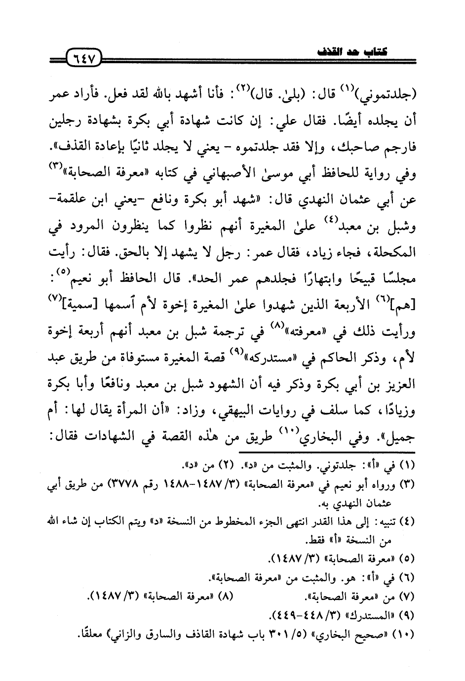 (جلدتموني) قَالَ: (بلَى. قَالَ) : فَأَنا أشهد بِاللَّه لقد فعل. فَأَرَادَ عمر أَن يجلده أَيْضا. فَقَالَ عَلّي: إِن كَانَت شَهَادَة أبي بكرَة بِشَهَادَة رجلَيْنِ فارجم صَاحبك، وَإِلَّا فقد جلدتموه - يَعْنِي لَا يجلد ثَانِيًا بِإِعَادَة الْقَذْف» . وَفِي رِوَايَة لِلْحَافِظِ أبي مُوسَى الْأَصْبَهَانِيّ فِي كِتَابه «معرفَة الصَّحَابَة» عَن أبي عُثْمَان النَّهْدِيّ قَالَ: «شهد أَبُو بكرَة وَنَافِع - يَعْنِي ابْن عَلْقَمَة - وشبل بن معبد عَلَى الْمُغيرَة أَنهم نظرُوا كَمَا ينظرُونَ المرود فِي المكحلة، فجَاء زِيَاد، فَقَالَ عمر: رجل لَا يشْهد إِلَّا بِالْحَقِّ. فَقَالَ: رَأَيْت مَجْلِسا قبيحًا وابتهارًا فجلدهم عمر الْحَد» . قَالَ الْحَافِظ أَبُو نعيم: [هم] الْأَرْبَعَة الَّذين شهدُوا عَلَى الْمُغيرَة إخْوَة لأم اسْمهَا [سميَّة] وَرَأَيْت ذَلِك فِي «مَعْرفَته» فِي تَرْجَمَة شبْل بن معبد أَنهم أَرْبَعَة إخْوَة لأم، وَذكر الْحَاكِم فِي «مُسْتَدْركه» قصَّة الْمُغيرَة مستوفاة من طَرِيق عبد الْعَزِيز بن أبي بكرَة وَذكر فِيهِ أَن الشُّهُود شبْل بن معبد ونافعًا وَأَبا بكرَة وزيادًا، كَمَا سلف فِي رِوَايَات الْبَيْهَقِيّ، وَزَاد: «أَن الْمَرْأَة يُقَال لَهَا: أم جميل» . وَفِي البُخَارِيّ طَرِيق من هَذِه الْقِصَّة فِي الشَّهَادَات فَقَالَ: