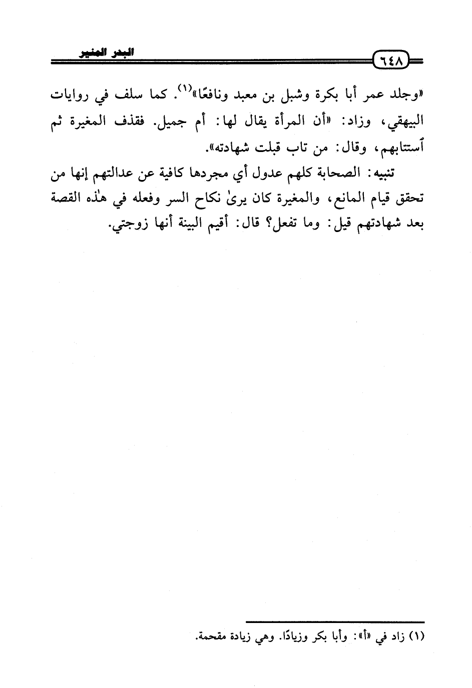 «وَجلد عمر أَبَا بكرَة وشبل بن معبد ونافعًا» . كَمَا سلف فِي رِوَايَات الْبَيْهَقِيّ، وَزَاد: «أَن الْمَرْأَة يُقَال لَهَا: أم جميل. فقذف الْمُغيرَة ثمَّ استتابهم، وَقَالَ: من تَابَ قبلت شَهَادَته» .