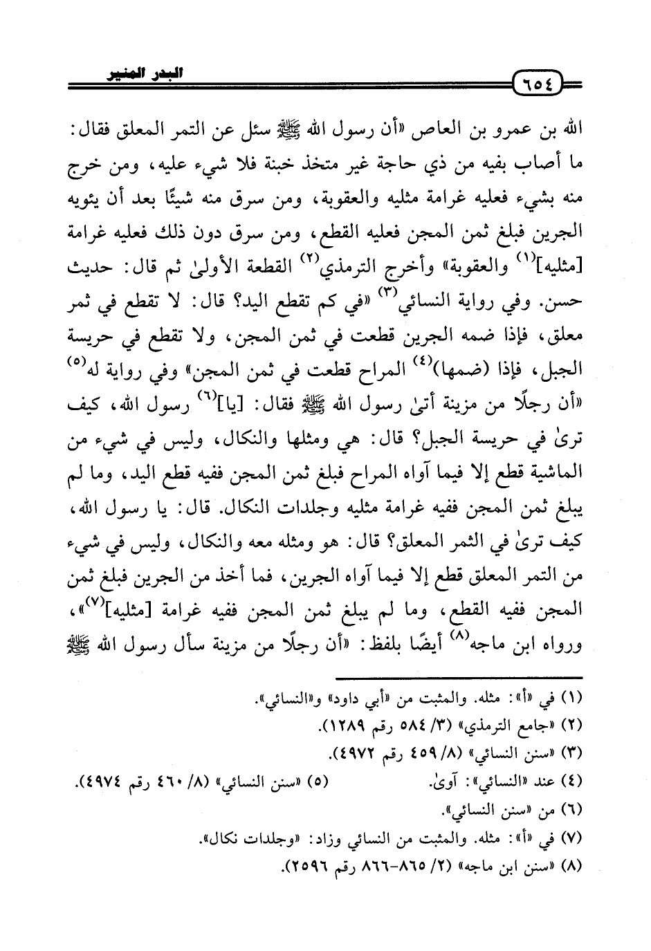 الله بن عَمْرو بن الْعَاصِ «أَن رَسُول الله - صَلَّى الله عَلَيْهِ وَسلم - سُئِلَ عَن التَّمْر الْمُعَلق فَقَالَ: مَا أصَاب بِفِيهِ من ذِي حَاجَة غير متخذ خبنة فَلَا شَيْء عَلَيْهِ، وَمن خرج مِنْهُ بِشَيْء فَعَلَيهِ غَرَامَة مثلَيْهِ والعقوبة، وَمن سرق مِنْهُ شَيْئا بعد أَن يئويه الجرين فَبلغ ثمن الْمِجَن فَعَلَيهِ الْقطع، وَمن سرق دون ذَلِك فَعَلَيهِ غَرَامَة [مثلَيْهِ] والعقوبة» وَأخرج التِّرْمِذِيّ الْقطعَة الأولَى ثمَّ قَالَ: حَدِيث حسن. وَفِي رِوَايَة النَّسَائِيّ «فِي كم تقطع الْيَد؟ قَالَ: لَا تقطع فِي ثَمَر مُعَلّق، فَإِذا ضمه الجرين قطعت فِي ثمن الْمِجَن، وَلَا تقطع فِي حريسة الْجَبَل، فَإِذا (ضمهَا) المراح قطعت فِي ثمن الْمِجَن» وَفِي رِوَايَة لَهُ «أَن رجلا من مزينة أَتَى الرَّسُول الله - صَلَّى الله عَلَيْهِ وَسلم - فَقَالَ: [يَا] رَسُول الله، كَيفَ ترَى فِي حريسة الْجَبَل؟ قَالَ: هِيَ وَمثلهَا والنكال، وَلَيْسَ فِي شَيْء من الْمَاشِيَة قطع إِلَّا فِيمَا آواه المراح فَبلغ ثمن الْمِجَن فَفِيهِ قطع الْيَد، وَمَا لم يبلغ ثمن الْمِجَن فَفِيهِ غَرَامَة مثلَيْهِ وجلدات النكال. قَالَ: يَا رَسُول الله، كَيفَ ترَى فِي الثَّمر الْمُعَلق؟ قَالَ: هُوَ وَمثله مَعَه والنكال، وَلَيْسَ فِي شَيْء من التَّمْر الْمُعَلق قطع إِلَّا فِيمَا آواه الجرين، فَمَا أَخذ من الجرين فَبلغ ثمن الْمِجَن فَفِيهِ الْقطع، وَمَا لم يبلغ ثمن الْمِجَن فَفِيهِ غَرَامَة [مثلَيْهِ] » ، وَرَوَاهُ ابْن مَاجَه أَيْضا بِلَفْظ: «أَن رجلا من مزينة سَأَلَ رَسُول الله - صَلَّى الله عَلَيْهِ وَسلم -