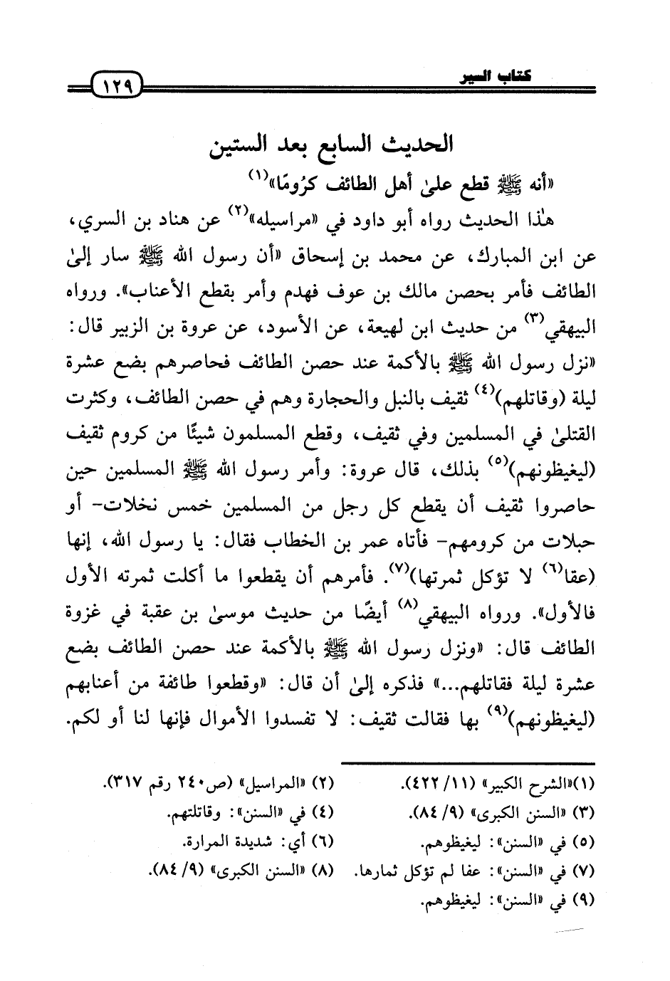 هَذَا الحَدِيث رَوَاهُ أَبُو دَاوُد فِي «مراسيله» عَن هناد بن السّري، عَن ابْن الْمُبَارك، عَن مُحَمَّد بن إِسْحَاق «أَن رَسُول الله - صَلَّى الله عَلَيْهِ وَسلم - سَار إِلَى الطَّائِف فَأمر بحصن مَالك بن عَوْف فهدم وَأمر بِقطع الأعناب» . وَرَوَاهُ الْبَيْهَقِيّ من حَدِيث ابْن لَهِيعَة، عَن الْأسود، عَن عُرْوَة بن الزبير قَالَ: «نزل رَسُول الله - صَلَّى الله عَلَيْهِ وَسلم - بالأكمة عِنْد حصن الطَّائِف فَحَاصَرَهُمْ بضع عشرَة لَيْلَة (وَقَاتلهمْ) ثَقِيف بِالنَّبلِ وَالْحِجَارَة وهم فِي حصن الطَّائِف، وَكَثُرت الْقَتْلَى فِي الْمُسلمين وَفِي ثَقِيف، وَقطع الْمُسلمُونَ شَيْئا من كروم ثَقِيف (ليغيظونهم) بذلك، قَالَ عُرْوَة: وَأمر رَسُول الله - صَلَّى الله عَلَيْهِ وَسلم - الْمُسلمين حِين حاصروا ثَقِيف أَن يقطع كل رجل من الْمُسلمين خمس نخلات - أَو حبلات من كرومهم - فَأَتَاهُ عمر بن الْخطاب فَقَالَ: يَا رَسُول الله، إِنَّهَا (عقا لَا تُؤْكَل ثَمَرَتهَا) . فَأَمرهمْ أَن يقطعوا مَا أكلت ثَمَرَته الأول فَالْأول» . وَرَوَاهُ الْبَيْهَقِيّ أَيْضا من حَدِيث مُوسَى بن عقبَة فِي غَزْوَة الطَّائِف قَالَ: «وَنزل رَسُول الله - صَلَّى الله عَلَيْهِ وَسلم - بالأكمة عِنْد حصن الطَّائِف بضع عشرَة لَيْلَة فَقَاتلهُمْ ... » فَذكره إِلَى أَن قَالَ: «وَقَطعُوا طَائِفَة من أعنابهم (ليغيظونهم) بهَا فَقَالَت ثَقِيف: لَا تفسدوا الْأَمْوَال فَإِنَّهَا لنا أَو لكم.
