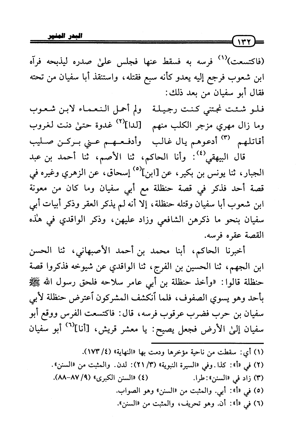 قَالَ الْبَيْهَقِيّ: وَأَنا الْحَاكِم، ثَنَا الْأَصَم، ثَنَا أَحْمد بن عبد الْجَبَّار، ثَنَا يُونُس بن بكير، عَن [ابْن] إِسْحَاق، عَن الزُّهْرِيّ وَغَيره فِي قصَّة أحد فَذكر فِي قصَّة حَنْظَلَة مَعَ أبي سُفْيَان وَمَا كَانَ من مَعُونَة ابْن شعوب أَبَا سُفْيَان وَقَتله حَنْظَلَة، إِلَّا أَنه لم يذكر الْعقر وَذكر أَبْيَات أبي سُفْيَان بِنَحْوِ مَا ذكرهن الشَّافِعِي وَزَاد عَلَيْهِنَّ، وَذكر الْوَاقِدِيّ فِي هَذِه الْقِصَّة عقره فرسه.