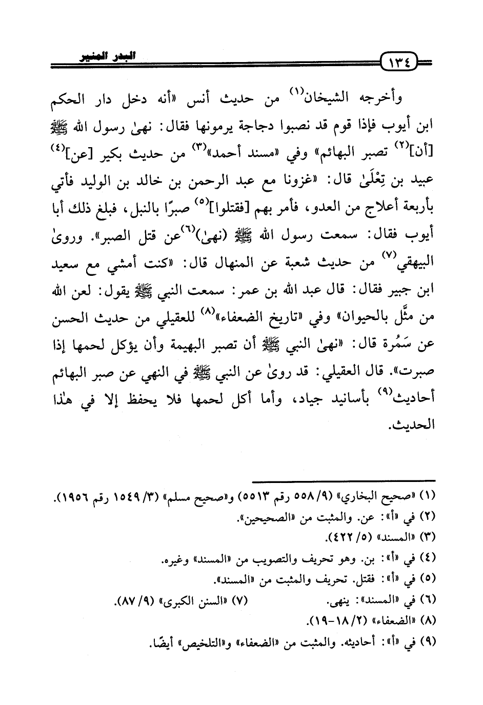 وَأخرجه الشَّيْخَانِ من حَدِيث أنس «أَنه دخل دَار الحكم بن أَيُّوب فَإِذا قوم قد نصبوا دجَاجَة يَرْمُونَهَا فَقَالَ: نهَى رَسُول الله - صَلَّى الله عَلَيْهِ وَسلم -[أَن] تصبر الْبَهَائِم» وَفِي «مُسْند أَحْمد» من حَدِيث بكير [عَن] عبيد بن تِعْلَى قَالَ: «غزونا مَعَ عبد الرَّحْمَن بن خَالِد بن الْوَلِيد فَأتي بأَرْبعَة أعلاج من الْعَدو، فَأمر بهم [فَقتلُوا] صبرا بِالنَّبلِ، فَبلغ ذَلِك أَبَا أَيُّوب فَقَالَ: سَمِعت رَسُول الله - صَلَّى الله عَلَيْهِ وَسلم - (نهَى) عَن قتل الصَّبْر» . وَرَوَى الْبَيْهَقِيّ من حَدِيث شُعْبَة عَن الْمنْهَال قَالَ: «كنت أَمْشِي مَعَ سعيد بن جُبَير فَقَالَ: قَالَ عبد الله بن عمر: سَمِعت النَّبِي - صَلَّى الله عَلَيْهِ وَسلم - يَقُول: لعن الله من مثَّل بِالْحَيَوَانِ» وَفِي «تَارِيخ الضُّعَفَاء» للعقيلي من حَدِيث الْحسن عَن سَمُرة قَالَ: «نهَى النَّبِي - صَلَّى الله عَلَيْهِ وَسلم - أَن تصبر الْبَهِيمَة وَأَن يُؤْكَل لَحمهَا إِذا صبرت» . قَالَ الْعقيلِيّ: قد رَوَى عَن النَّبِي - صَلَّى الله عَلَيْهِ وَسلم - فِي النَّهْي عَن صَبر الْبَهَائِم أَحَادِيث بأسانيد جِيَاد، وَأما أكل لَحمهَا فَلَا يحفظ إِلَّا فِي هَذَا الحَدِيث.