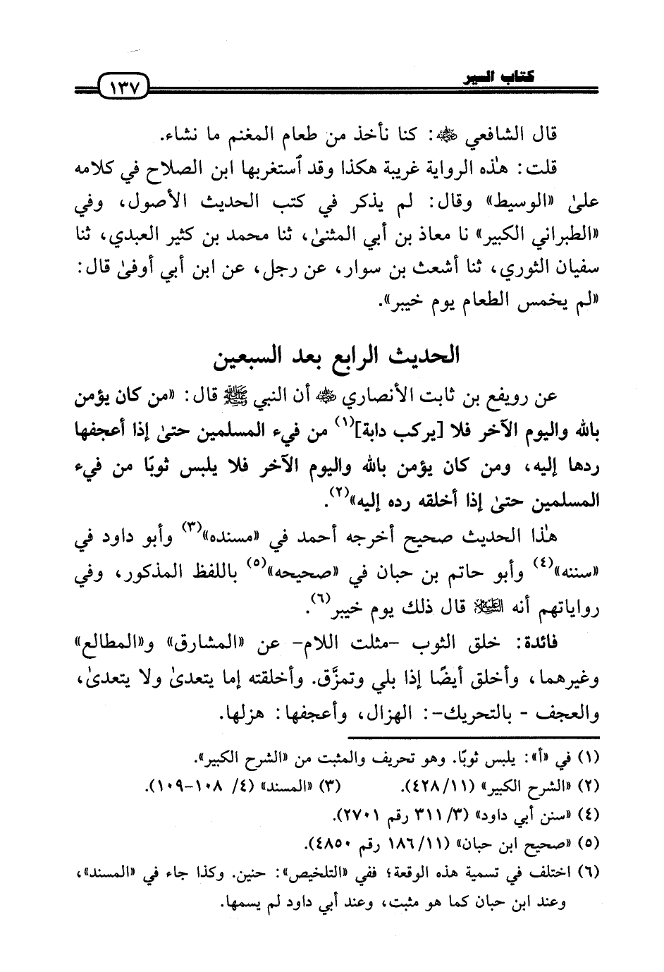 عَن رويفع بن ثَابت الْأنْصَارِيّ رَضِيَ اللَّهُ عَنْه أَن النَّبِي - صَلَّى الله عَلَيْهِ وَسلم - قَالَ: «من كَانَ يُؤمن بِاللَّه وَالْيَوْم الآخر فَلَا [يركب دَابَّة] من فَيْء الْمُسلمين حَتَّى إِذا أعجفها ردهَا إِلَيْهِ، وَمن كَانَ يُؤمن بِاللَّه وَالْيَوْم الآخر فَلَا يلبس ثوبا من فَيْء الْمُسلمين حَتَّى إِذا أخلقه رده إِلَيْهِ» .