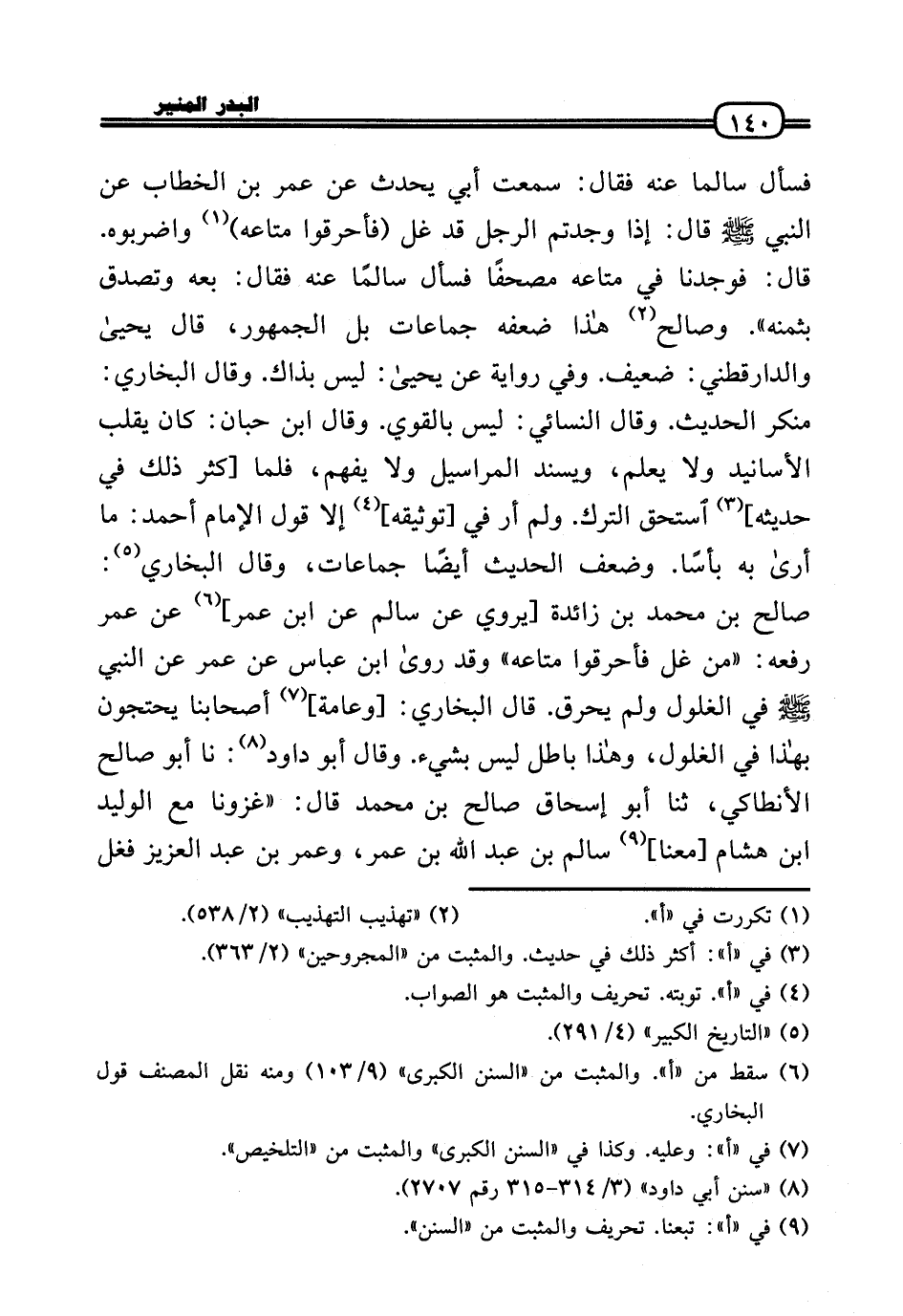 فَسَأَلَ سالما عَنهُ فَقَالَ: سَمِعت أبي يحدث عَن عمر بن الْخطاب عَن النَّبِي - صَلَّى الله عَلَيْهِ وَسلم - قَالَ: إِذا وجدْتُم الرجل قد غل (فأحرقوا مَتَاعه) واضربوه. قَالَ: فَوَجَدنَا فِي مَتَاعه مُصحفا فَسَأَلَ سالما عَنهُ فَقَالَ: بِعْهُ وَتصدق بِثمنِهِ» . وَصَالح هَذَا ضعفه جماعات بل الْجُمْهُور، قَالَ يَحْيَى وَالدَّارَقُطْنِيّ: ضَعِيف. وَفِي رِوَايَة عَن يَحْيَى: لَيْسَ بِذَاكَ. وَقَالَ البُخَارِيّ: مُنكر الحَدِيث. وَقَالَ النَّسَائِيّ: لَيْسَ بِالْقَوِيّ. وَقَالَ ابْن حبَان: كَانَ يقلب الْأَسَانِيد وَلَا يعلم، ويسند الْمَرَاسِيل وَلَا يفهم، فَلَمَّا [كثر ذَلِك فِي حَدِيثه] اسْتحق التّرْك. وَلم أر فِي [توثيقه] إِلَّا قَول الإِمَام أَحْمد: مَا أرَى بِهِ بَأْسا. وَضعف الحَدِيث أَيْضا جماعات، وَقَالَ البُخَارِيّ: صَالح بن مُحَمَّد بن زَائِدَة [يروي عَن سَالم عَن ابْن عمر] عَن عمر رَفعه: «من غل فأحرقوا مَتَاعه» وَقد رَوَى ابْن عَبَّاس عَن عمر عَن النَّبِي - صَلَّى الله عَلَيْهِ وَسلم - فِي الْغلُول وَلم يحرق. قَالَ البُخَارِيّ: [وَعَامة] أَصْحَابنَا يحتجون بِهَذَا فِي الْغلُول، وَهَذَا بَاطِل لَيْسَ بِشَيْء. وَقَالَ أَبُو دَاوُد: نَا أَبُو صَالح الْأَنْطَاكِي، ثَنَا أَبُو إِسْحَاق صَالح بن مُحَمَّد قَالَ: «غزونا مَعَ الْوَلِيد بن هِشَام [مَعنا] سَالم بن عبد الله بن عمر، وَعمر بن عبد الْعَزِيز فَغَلَّ