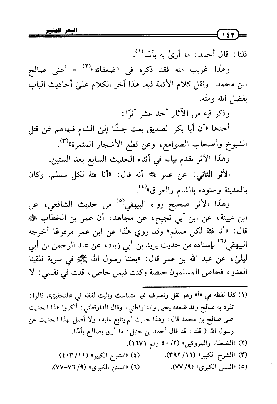 وَهَذَا الْأَثر صَحِيح رَوَاهُ الْبَيْهَقِيّ من حَدِيث الشَّافِعِي، عَن ابْن عُيَيْنَة، عَن ابْن أبي نجيح، عَن مُجَاهِد، أَن عمر بن الْخطاب رَضِيَ اللَّهُ عَنْه قَالَ: «أَنا فِئَة لكل مُسلم» وَقد رُوِيَ هَذَا عَن ابْن عمر مَرْفُوعا أخرجه الْبَيْهَقِيّ بِإِسْنَادِهِ من حَدِيث يزِيد بن أبي زِيَاد، عَن عبد الرَّحْمَن بن أبي لَيْلَى، عَن عبد الله بن عمر قَالَ: «بعثنَا رَسُول الله - صَلَّى الله عَلَيْهِ وَسلم - فِي سَرِيَّة فلقينا الْعَدو، فَحَاص الْمُسلمُونَ حَيْصَة وَكنت فِيمَن حَاص، قلت فِي نَفسِي: لَا