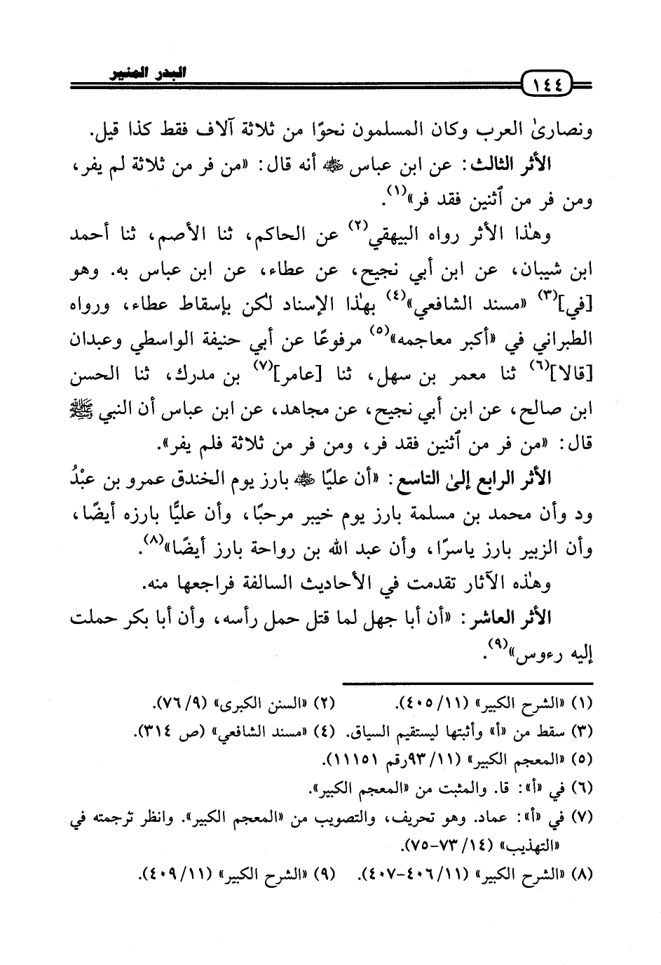 وَهَذَا الْأَثر رَوَاهُ الْبَيْهَقِيّ عَن الْحَاكِم، ثَنَا الْأَصَم، ثَنَا أَحْمد بن شَيبَان، عَن ابْن أبي نجيح، عَن عَطاء، عَن ابْن عَبَّاس بِهِ. وَهُوَ [فِي] «مُسْند الشَّافِعِي» بِهَذَا الْإِسْنَاد لَكِن بِإِسْقَاط عَطاء، وَرَوَاهُ الطَّبَرَانِيّ فِي «أكبر معاجمه» مَرْفُوعا عَن أبي حنيفَة الوَاسِطِيّ وعبدان [قَالَا] ثَنَا معمر بن سهل، ثَنَا [عَامر] بن مدرك، ثَنَا الْحسن بن صَالح، عَن ابْن أبي نجيح، عَن مُجَاهِد، عَن ابْن عَبَّاس أَن النَّبِي - صَلَّى الله عَلَيْهِ وَسلم - قَالَ: «من فر من اثْنَيْنِ فقد فر، وَمن فر من ثَلَاثَة فَلم يفر» .