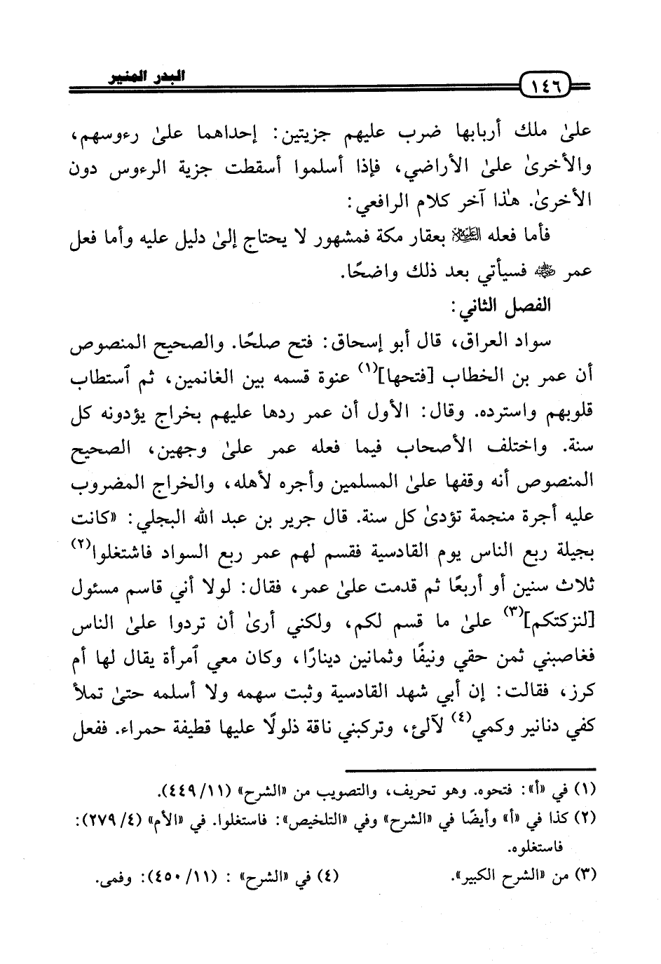 سَواد الْعرَاق، قَالَ أَبُو إِسْحَاق: فتح صلحا. وَالصَّحِيح الْمَنْصُوص أَن عمر بن الْخطاب [فتحهَا] عنْوَة قسمه بَين الْغَانِمين، ثمَّ استطاب قُلُوبهم واسترده. وَقَالَ: الأول أَن عمر ردهَا عَلَيْهِم بخراج يؤدونه كل سنة. وَاخْتلف الْأَصْحَاب فِيمَا فعله عمر عَلَى وَجْهَيْن، الصَّحِيح الْمَنْصُوص أَنه وَقفهَا عَلَى الْمُسلمين وأجره لأَهله، وَالْخَرَاج الْمَضْرُوب عَلَيْهِ أُجْرَة منجمة تُؤَدَّى كل سنة. قَالَ جرير بن عبد الله البَجلِيّ: «كَانَت بجيلة ربع النَّاس يَوْم الْقَادِسِيَّة فقسم لَهُم عمر ربع السوَاد فاشتغلوا ثَلَاث سِنِين أَو أَرْبعا ثمَّ قدمت عَلَى عمر، فَقَالَ: لَوْلَا أَنِّي قَاسم مسئول [لنزكتكم] عَلَى مَا قسم لكم، وَلَكِنِّي أرَى أَن تردوا عَلَى النَّاس فغاصبني ثمن حَقي ونيفًا وَثَمَانِينَ دِينَارا، وَكَانَ معي امْرَأَة يُقَال لَهَا أم كرز، فَقَالَت: إِن أبي شهد الْقَادِسِيَّة وَثَبت سَهْمه وَلَا أسلمه حَتَّى تملأ كفي دَنَانِير وكمي لآلئ، وتركبني نَاقَة ذلولًا عَلَيْهَا قطيفة حَمْرَاء. فَفعل