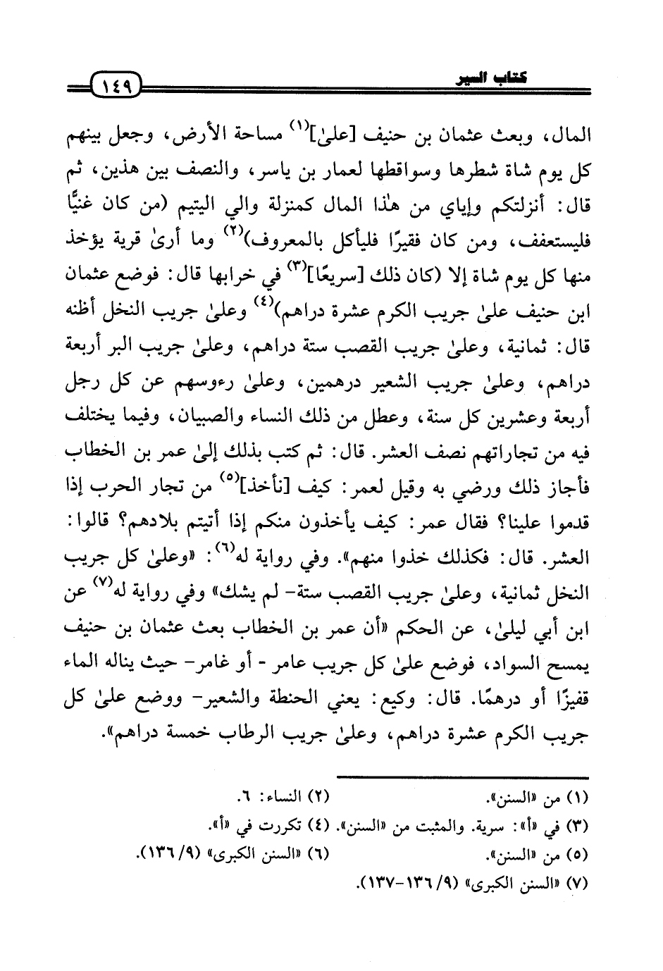 المَال، وَبعث عُثْمَان بن حنيف [عَلَى] مساحة الأَرْض، وَجعل بَينهم كل يَوْم شَاة شطرها وسواقطها لعمَّار بن يَاسر، وَالنّصف بَين هذَيْن، ثمَّ قَالَ: أنزلتكم وإياي من هَذَا المَال كمنزلة وَالِي الْيَتِيم (من كَانَ غنيًّا فليستعفف، وَمن كَانَ فَقِيرا فَليَأْكُل بِالْمَعْرُوفِ) ، وَمَا أرَى قَرْيَة يُؤْخَذ مِنْهَا كل يَوْم شَاة إِلَّا (كَانَ ذَلِك [سَرِيعا] فِي خرابها قَالَ: فَوضع عُثْمَان بن حنيف عَلَى جريب الْكَرم عشرَة دَرَاهِم) وَعَلَى جريب النّخل أَظُنهُ قَالَ: ثَمَانِيَة، وَعَلَى جريب الْقصب سِتَّة دَرَاهِم، وَعَلَى جريب الْبر أَرْبَعَة دَرَاهِم، وَعَلَى جريب الشّعير دِرْهَمَيْنِ، وَعَلَى رُءُوسهم عَن كل رجل أَرْبَعَة وَعشْرين كل سنة، وعطل من ذَلِك النِّسَاء وَالصبيان، وَفِيمَا يخْتَلف فِيهِ من تجاراتهم نصف الْعشْر. قَالَ: ثمَّ كتب بذلك إِلَى عمر بن الْخطاب فَأجَاز ذَلِك وَرَضي بِهِ وَقيل لعمر: كَيفَ [نَأْخُذ] من تجار الْحَرْب إِذا قدمُوا علينا؟ فَقَالَ عمر: كَيفَ يَأْخُذُونَ مِنْكُم إِذا أتيتم بِلَادهمْ؟ قَالُوا: الْعشْر. قَالَ: فَكَذَلِك خُذُوا مِنْهُم» . وَفِي رِوَايَة لَهُ: «وَعَلَى كل جريب النّخل ثَمَانِيَة، وَعَلَى جريب الْقصب سِتَّة - لم يشك» وَفِي رِوَايَة لَهُ عَن ابْن أبي لَيْلَى، عَن الحكم «أَن عمر بن الْخطاب بعث عُثْمَان بن حنيف يمسح السوَاد، فَوضع عَلَى كل جريب عَامر - أوغامر - حَيْثُ يَنَالهُ المَاء قَفِيزا أَو درهما. قَالَ: وَكِيع: يَعْنِي الْحِنْطَة وَالشعِير - وَوضع عَلَى كل جريب الْكَرم عشرَة دَرَاهِم، وَعَلَى جريب الرطاب خَمْسَة دَرَاهِم» .