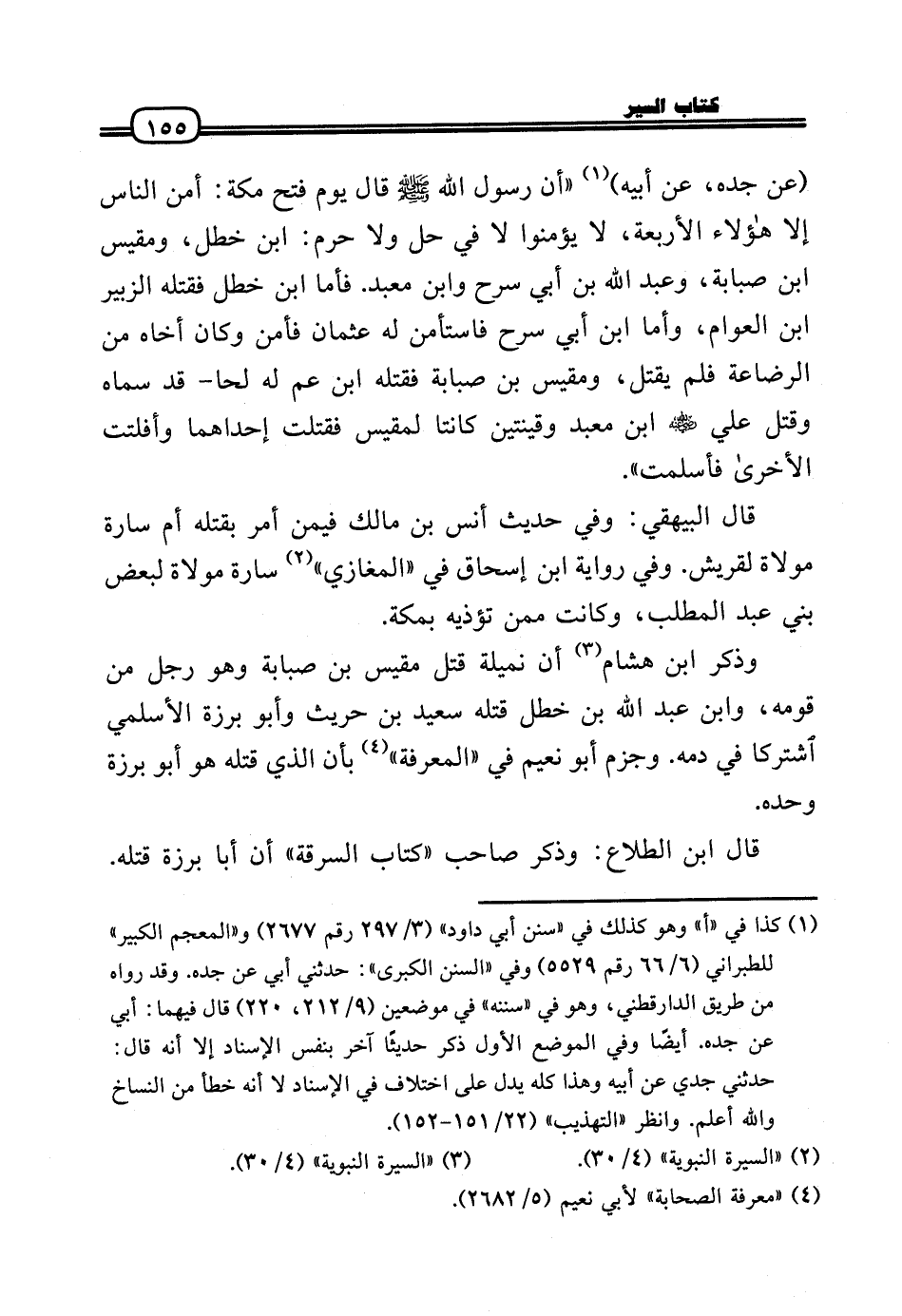 (عَن جده، عَن أَبِيه) «أَن رَسُول الله - صَلَّى الله عَلَيْهِ وَسلم - قَالَ يَوْم فتح مَكَّة: أَمن النَّاس إِلَّا هَؤُلَاءِ الْأَرْبَعَة، لَا يُؤمنُوا لَا فِي حل وَلَا حرم: ابْن خطل، وَمقيس بن صبَابَة، وَعبد الله بن أبي سرح وَابْن معبد. فَأَما ابْن خطل فَقتله الزبير بن الْعَوام، وَأما ابْن أبي سرح فاستأمن لَهُ عُثْمَان فأمن وَكَانَ أَخَاهُ من الرضَاعَة فَلم يقتل، وَمقيس بن صبَابَة فَقتله ابْن عَم لَهُ لحا - قد سَمَّاهُ وَقتل عَلّي رَضِيَ اللَّهُ عَنْه ابْن معبد وقينتين كَانَتَا لمقيس فقتلت إِحْدَاهمَا وأفلتت الْأُخْرَى فَأسْلمت» .
