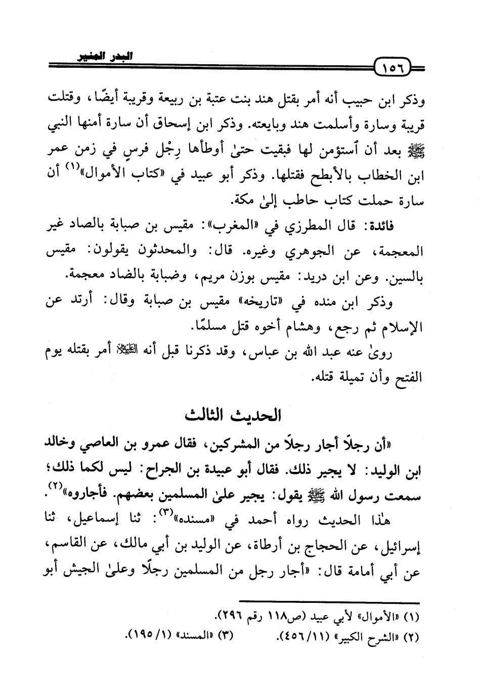 «أَن رجلا أَجَارَ رجلا من الْمُشْركين، فَقَالَ عَمْرو بن العَاصِي وخَالِد بن الْوَلِيد: لَا يجير ذَلِك. فَقَالَ أَبُو عُبَيْدَة بن الْجراح: لَيْسَ لَكمَا ذَلِك؛ سَمِعت رَسُول الله - صَلَّى الله عَلَيْهِ وَسلم - يَقُول: يجير عَلَى الْمُسلمين بَعضهم. فأجاروه» .