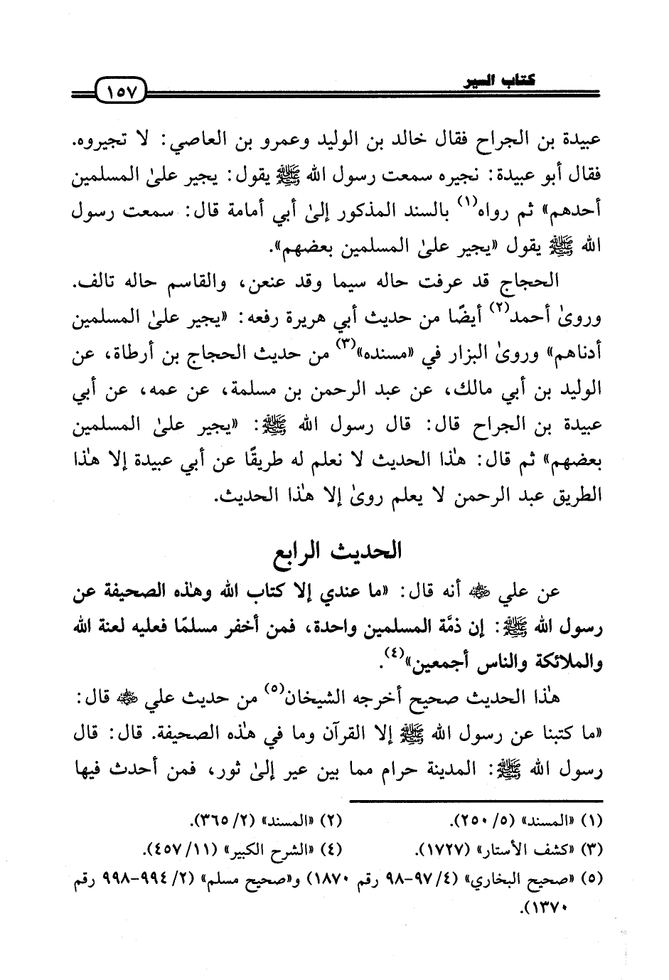عَن عَلّي رَضِيَ اللَّهُ عَنْه أَنه قَالَ: «مَا عِنْدِي إِلَّا كتاب الله وَهَذِه الصَّحِيفَة عَن رَسُول الله - صَلَّى الله عَلَيْهِ وَسلم -: إِن ذمَّة الْمُسلمين وَاحِدَة، فَمن أَخْفَر مُسلما فَعَلَيهِ لعنة الله وَالْمَلَائِكَة وَالنَّاس أَجْمَعِينَ» .