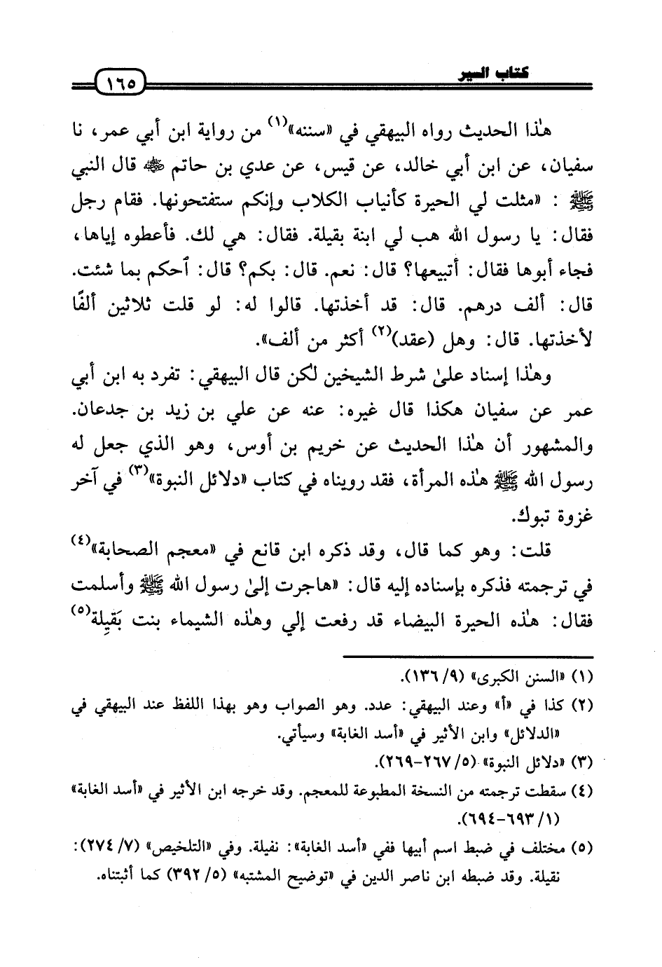 هَذَا الحَدِيث رَوَاهُ الْبَيْهَقِيّ فِي «سنَنه» من رِوَايَة ابْن أبي عمر، نَا سُفْيَان، عَن ابْن أبي خَالِد، عَن قيس، عَن عدي بن حَاتِم رَضِيَ اللَّهُ عَنْه قَالَ النَّبِي - صَلَّى الله عَلَيْهِ وَسلم -: «مثلت لي الْحيرَة كأنياب الْكلاب وَإِنَّكُمْ ستفتحونها. فَقَامَ رجل فَقَالَ: يَا رَسُول الله هَب لي ابْنة بقيلة. فَقَالَ: هِيَ لَك. فَأَعْطوهُ إِيَّاهَا، فجَاء أَبوهَا فَقَالَ: أتبيعها؟ قَالَ: نعم. قَالَ: بكم؟ قَالَ: احكم بِمَا شِئْت. قَالَ: ألف دِرْهَم. قَالَ: قد أَخَذتهَا. قَالُوا لَهُ: لَو قلت ثَلَاثِينَ ألفا لأخذتها. قَالَ: وَهل (عقد) أَكثر من ألف» .