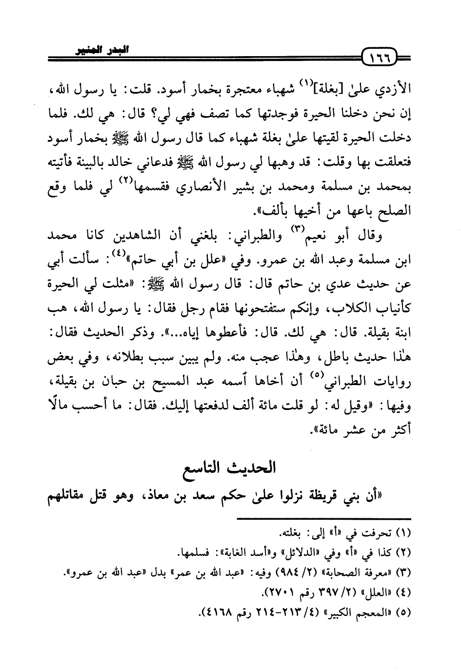 وَقَالَ أَبُو نعيم وَالطَّبَرَانِيّ: بَلغنِي أَن الشَّاهِدين كَانَا مُحَمَّد بن مسلمة وَعبد الله بن عَمْرو. وَفِي «علل بن أبي حَاتِم» : سَأَلت أبي عَن حَدِيث عدي بن حَاتِم قَالَ: قَالَ رَسُول الله - صَلَّى الله عَلَيْهِ وَسلم -: «مثلت لي الْحيرَة كأنياب الْكلاب، وَإِنَّكُمْ ستفتحونها فَقَامَ رجل فَقَالَ: يَا رَسُول الله، هَب ابْنة بقيلة. قَالَ: هِيَ لَك. قَالَ: فأعطوها إِيَّاه ... » . وَذكر الحَدِيث فَقَالَ: هَذَا حَدِيث بَاطِل، وَهَذَا عجب مِنْهُ. وَلم يبين سَبَب بُطْلَانه، وَفِي بعض رِوَايَات الطَّبَرَانِيّ أَن أخاها اسْمه عبد الْمَسِيح بن حبَان بن بقيلة، وفيهَا: «وَقيل لَهُ: لَو قلت مائَة ألف لدفعتها إِلَيْك. فَقَالَ: مَا أَحسب مَالا أَكثر من عشر مائَة» .