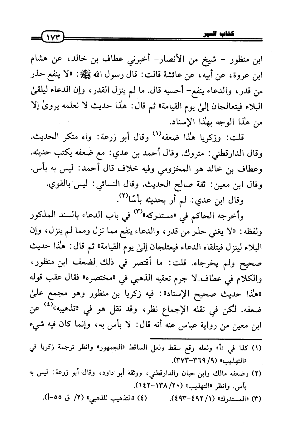 وَأخرجه الْحَاكِم فِي «مُسْتَدْركه» فِي بَاب الدُّعَاء بالسند الْمَذْكُور وَلَفظه: «لَا يُغني حذر من قدر، وَالدُّعَاء ينفع مِمَّا نزل وَمِمَّا لم ينزل، وَإِن الْبلَاء لينزل فيتلقاه الدُّعَاء فيعتلجان إِلَى يَوْم الْقِيَامَة» ثمَّ قَالَ: هَذَا حَدِيث صَحِيح وَلم يخرجَاهُ. قلت: مَا اقْتصر فِي ذَلِك لضعف ابْن مَنْظُور، وَالْكَلَام فِي عطاف لَا جرم تعقبه الذَّهَبِيّ فِي «مُخْتَصره» فَقَالَ عقب قَوْله «هَذَا حَدِيث صَحِيح الْإِسْنَاد» : فِيهِ زَكَرِيَّا بن مَنْظُور وَهُوَ مجمع عَلَى ضعفه. لَكِن فِي نَقله الْإِجْمَاع نظر، وَقد نقل هُوَ فِي «تذهيبه» عَن ابْن معِين من رِوَايَة عَبَّاس عَنهُ أَنه قَالَ: لَا بَأْس بِهِ، وَإِنَّمَا كَانَ فِيهِ شَيْء