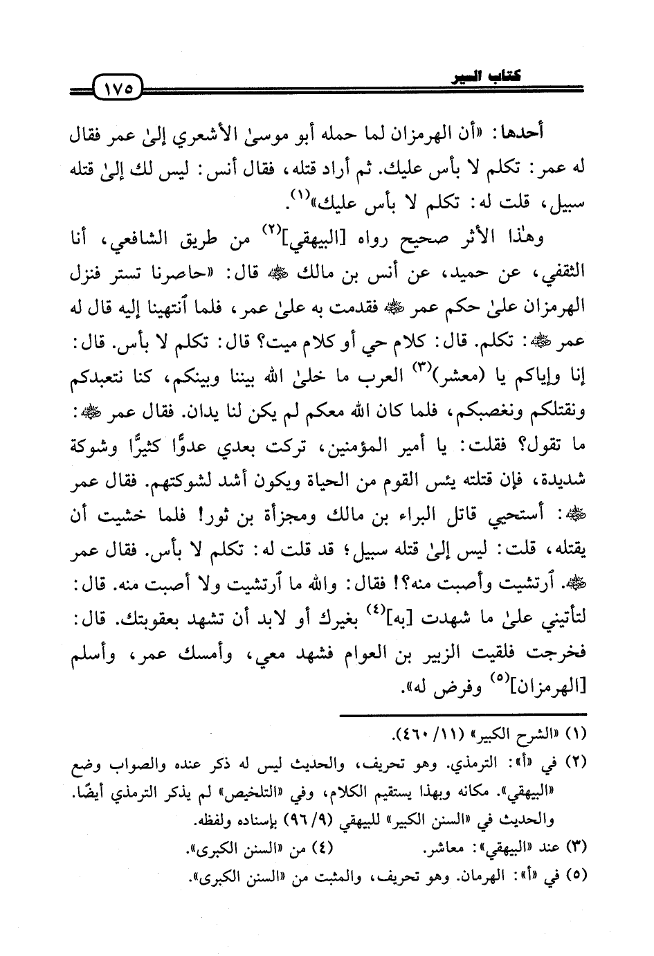 وَهَذَا الْأَثر صَحِيح رَوَاهُ [الْبَيْهَقِيّ] من طَرِيق الشَّافِعِي، أَنا الثَّقَفِيّ، عَن حميد، عَن أنس بن مَالك رَضِيَ اللَّهُ عَنْه قَالَ: «حاصرنا تستر فَنزل الهرمزان عَلَى حكم عمر رَضِيَ اللَّهُ عَنْه فَقدمت بِهِ عَلَى عمر، فَلَمَّا انتهينا إِلَيْهِ قَالَ لَهُ عمر رَضِيَ اللَّهُ عَنْه: تكلم. قَالَ: كَلَام حَيّ أَو كَلَام ميت؟ قَالَ: تكلم لَا بَأْس. قَالَ: إِنَّا وَإِيَّاكُم يَا (معشر) الْعَرَب مَا خَلى الله بَيْننَا وَبَيْنكُم، كُنَّا نتعبدكم ونقتلكم ونغصبكم، فَلَمَّا كَانَ الله مَعكُمْ لم يكن لنا يدان. فَقَالَ عمر رَضِيَ اللَّهُ عَنْه: مَا تَقول؟ فَقلت: يَا أَمِير الْمُؤمنِينَ، تركت بعدِي عدوًّا كثيرًّا وشوكة شَدِيدَة، فَإِن قتلته يئس الْقَوْم من الْحَيَاة وَيكون أَشد لشوكتهم. فَقَالَ عمر رَضِيَ اللَّهُ عَنْه: أستحيي قَاتل الْبَراء بن مَالك ومجزأة بن ثَوْر! فَلَمَّا خشيت أَن يقْتله، قلت: لَيْسَ إِلَى قَتله سَبِيل؛ قد قلت لَهُ: تكلم لَا بَأْس. فَقَالَ عمر رَضِيَ اللَّهُ عَنْه. ارتشيت وأصبت مِنْهُ؟ ! فَقَالَ: وَالله مَا ارتشيت وَلَا أصبت مِنْهُ. قَالَ: لتَأْتِيني عَلَى مَا شهِدت [بِهِ] بغيرك أَو لابد أَن تشهد بعقوبتك. قَالَ: فَخرجت فَلَقِيت الزبير بن الْعَوام فَشهد معي، وَأمْسك عمر، وَأسلم [الهرمزان] وَفرض لَهُ» .