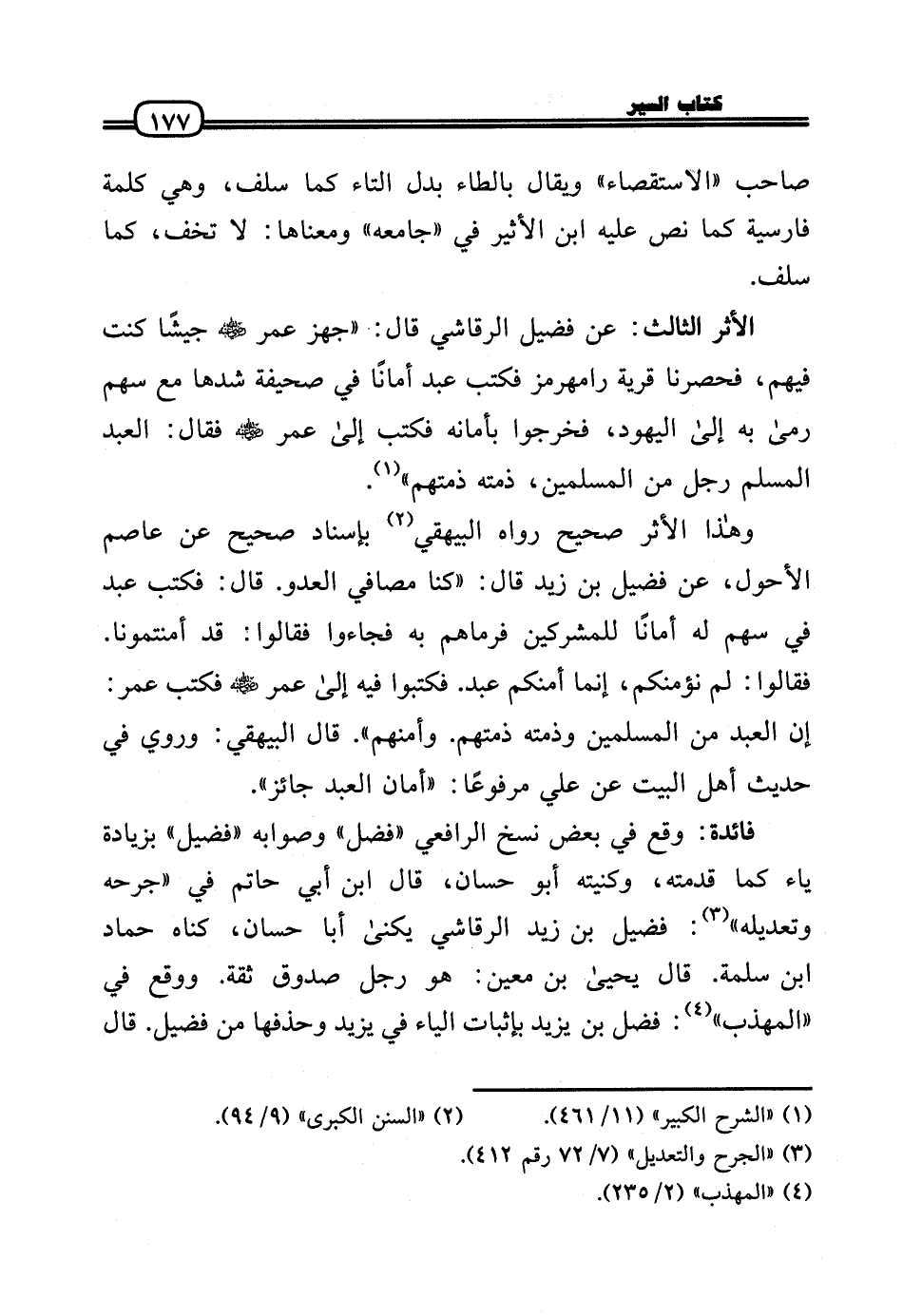 الْأَثر الثَّالِث: عَن فُضَيْل الرقاشِي قَالَ: «جهز عمر رَضِيَ اللَّهُ عَنْه جَيْشًا كنت فيهم، فحصرنا قَرْيَة رامهرمز فَكتب عبد أَمَانًا فِي صحيفَة شدها مَعَ سهم رَمَى بِهِ إِلَى الْيَهُود، فَخَرجُوا بأمانه فَكتب إِلَى عمر رَضِيَ اللَّهُ عَنْه فَقَالَ: العَبْد الْمُسلم رجل من الْمُسلمين، ذمَّته ذمتهم» .