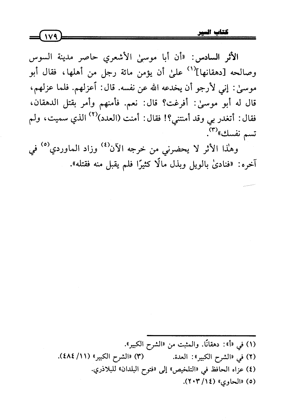 الْأَثر السَّادِس: «أَن أَبَا مُوسَى الْأَشْعَرِيّ حاصر مَدِينَة السوس وَصَالَحَهُ [دهقانها] عَلَى أَن يُؤمن مائَة رجل من أَهلهَا، فَقَالَ أَبُو مُوسَى: إِنِّي لأرجو أَن يخدعه الله عَن نَفسه. قَالَ: اعزلهم. فَلَمَّا عزلهم، قَالَ لَهُ أَبُو مُوسَى: أفرغت؟ قَالَ: نعم. فَأَمنَهُمْ وَأمر بقتل الدهْقَان، فَقَالَ: أتغدر بِي وَقد أمنتني؟ ! فَقَالَ: أمنت (الْعدَد) الَّذِي سميت، وَلم تسم نَفسك» .