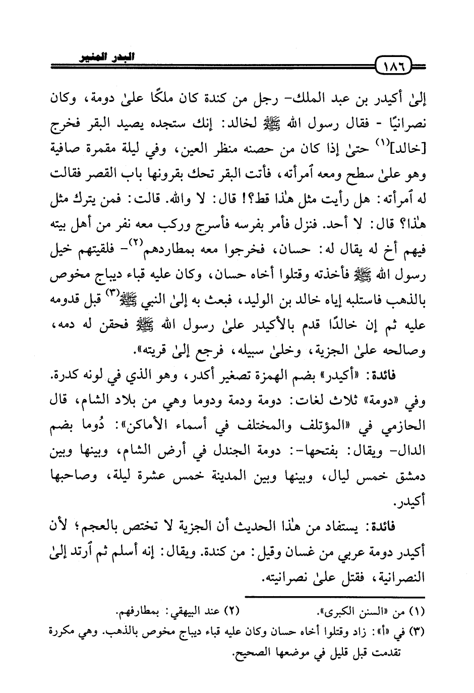 إِلَى أكيدر بن عبد الْملك - رجل من كِنْدَة كَانَ ملكا عَلَى دومة، وَكَانَ نَصْرَانِيّا - فَقَالَ رَسُول الله - صَلَّى الله عَلَيْهِ وَسلم - لخَالِد: إِنَّك ستجده يصيد الْبَقر فَخرج [خَالِد] حَتَّى إِذا كَانَ من حصنه منظر الْعين، وَفِي لَيْلَة مُقْمِرَة صَافِيَة وَهُوَ عَلَى سطح وَمَعَهُ امْرَأَته، فَأَتَت الْبَقر تحك بقرونها بَاب الْقصر فَقَالَت لَهُ امْرَأَته: هَل رَأَيْت مثل هَذَا قطّ؟ ! قَالَ: لَا وَالله. قَالَت: فَمن يتْرك مثل هَذَا؟ قَالَ: لَا أحد. فَنزل فَأمر بفرسه فأسرج وَركب مَعَه نفر من أهل بَيته فيهم أَخ لَهُ يُقَال لَهُ: حسان، فَخَرجُوا مَعَه بمطاردهم - فلقيتهم خيل رَسُول الله - صَلَّى الله عَلَيْهِ وَسلم - فَأَخَذته وَقتلُوا أَخَاهُ حسان، وَكَانَ عَلَيْهِ قبَاء ديباج مخوص بِالذَّهَب فاستلبه إِيَّاه خَالِد بن الْوَلِيد، فَبعث بِهِ إِلَى النَّبِي - صَلَّى الله عَلَيْهِ وَسلم - قبل قدومه عَلَيْهِ ثمَّ إِن خَالِدا قدم بالأكيدر عَلَى رَسُول الله - صَلَّى الله عَلَيْهِ وَسلم - فحقن لَهُ دَمه، وَصَالَحَهُ عَلَى الْجِزْيَة، وخلى سَبيله، فَرجع إِلَى قريته» .