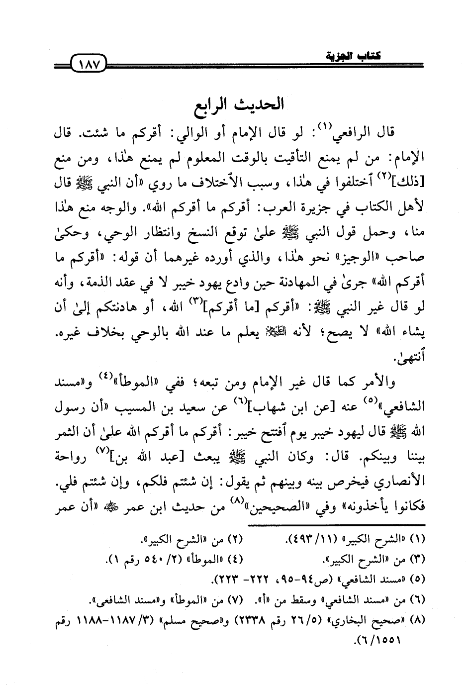 قَالَ الرَّافِعِيّ: لَو قَالَ الإِمَام أَو الْوَالِي: أقركم مَا شِئْت. قَالَ الإِمَام: من لم يمْنَع التَّأْقِيت بِالْوَقْتِ الْمَعْلُوم لم يمْنَع هَذَا، وَمن منع [ذَلِك] اخْتلفُوا فِي هَذَا، وَسبب الِاخْتِلَاف مَا رُوِيَ «أَن النَّبِي - صَلَّى الله عَلَيْهِ وَسلم - قَالَ لأهل الْكتاب فِي جَزِيرَة الْعَرَب: أقركم مَا أقركم الله» . وَالْوَجْه منع هَذَا منا، وَحمل قَول النَّبِي - صَلَّى الله عَلَيْهِ وَسلم - عَلَى توقع النّسخ وانتظار الْوَحْي، وَحَكَى صَاحب «الْوَجِيز» نَحْو هَذَا، وَالَّذِي أوردهُ غَيرهمَا أَن قَوْله: «أقركم مَا أقركم الله» جَرَى فِي المهادنة حِين وادع يهود خَيْبَر لَا فِي عقد الذِّمَّة، وَأَنه لَو قَالَ غير النَّبِي - صَلَّى الله عَلَيْهِ وَسلم -: «أقركم [مَا أقركم] الله، أَو هادنتكم إِلَى أَن يَشَاء الله» لَا يَصح؛ لِأَنَّهُ عَلَيْهِ السَّلَام يعلم مَا عِنْد الله بِالْوَحْي بِخِلَاف غَيره. انْتَهَى.