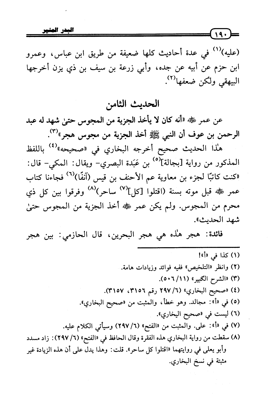 هَذَا الحَدِيث صَحِيح أخرجه البُخَارِيّ فِي «صَحِيحه» بِاللَّفْظِ الْمَذْكُور من رِوَايَة [بجالة] بن عَبَدة الْبَصْرِيّ - وَيُقَال: الْمَكِّيّ - قَالَ: «كنت كَاتبا لجزء بن مُعَاوِيَة عَم الْأَحْنَف بن قيس (آنِفا) فجاءنا كتاب عمر رَضِيَ اللَّهُ عَنْه قبل مَوته بِسنة (اقْتُلُوا [كل] سَاحر) وَفرقُوا بَين كل ذِي محرم من الْمَجُوس. وَلم يكن عمر رَضِيَ اللَّهُ عَنْه أَخذ الْجِزْيَة من الْمَجُوس حَتَّى شهد الحَدِيث» .