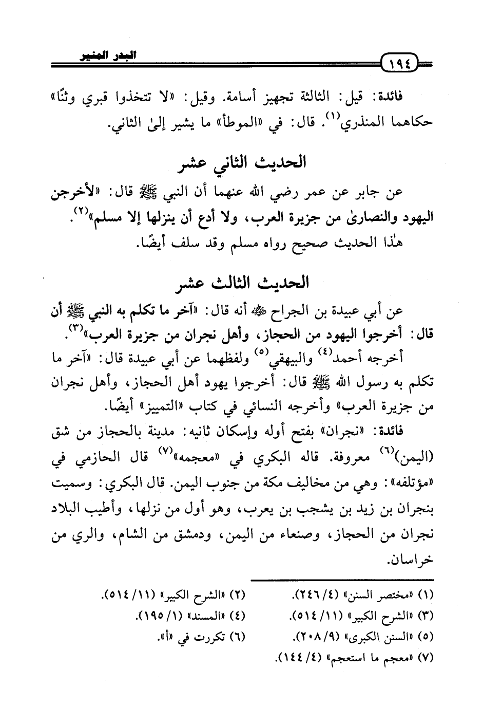 عَن أبي عُبَيْدَة بن الْجراح رَضِيَ اللَّهُ عَنْه أَنه قَالَ: «آخر مَا تكلم بِهِ النَّبِي - صَلَّى الله عَلَيْهِ وَسلم - أَن قَالَ: أخرجُوا الْيَهُود من الْحجاز، وَأهل نَجْرَان من جَزِيرَة الْعَرَب» .