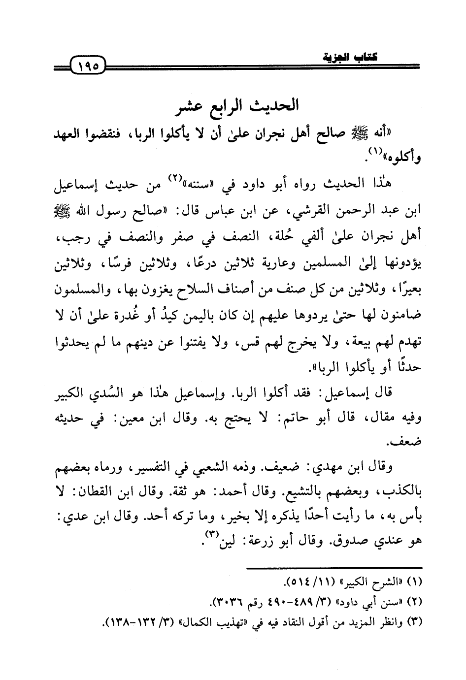 هَذَا الحَدِيث رَوَاهُ أَبُو دَاوُد فِي «سنَنه» من حَدِيث إِسْمَاعِيل بن عبد الرَّحْمَن الْقرشِي، عَن ابْن عَبَّاس قَالَ: «صَالح رَسُول الله - صَلَّى الله عَلَيْهِ وَسلم - أهل نَجْرَان عَلَى ألفي حُلة، النّصْف فِي صفر وَالنّصف فِي رَجَب، يؤدونها إِلَى الْمُسلمين وعارية ثَلَاثِينَ درعًا، وَثَلَاثِينَ فرسا، وَثَلَاثِينَ بَعِيرًا، وَثَلَاثِينَ من كل صنف من أَصْنَاف السِّلَاح يغزون بهَا، والمسلمون ضامنون لَهَا حَتَّى يردوها عَلَيْهِم إِن كَانَ بِالْيمن كيدُ أَو غُدرة عَلَى أَن لَا تهدم لَهُم بيعَة، وَلَا يخرج لَهُم قس، وَلَا يفتنوا عَن دينهم مَا لم يحدثوا حَدثا أَو يَأْكُلُوا الرِّبَا» .