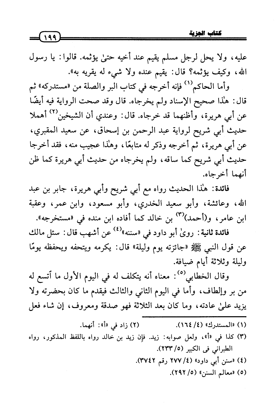 فَائِدَة ثَانِيَة: رَوَى أَبُو دَاوُد فِي «سنَنه» عَن أَشهب قَالَ: سُئِلَ مَالك عَن قَول النَّبِي - صَلَّى الله عَلَيْهِ وَسلم - «جائزته يَوْم وَلَيْلَة» قَالَ: يُكرمهُ ويتحفه ويحفظه يَوْمًا وَلَيْلَة وَثَلَاثَة أَيَّام ضِيَافَة.
