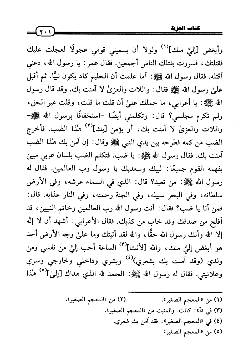 وَأبْغض [إليَّ مِنْك] وَلَوْلَا أَن يسميني قومِي عجولاً لعجلت عَلَيْك فقتلتك، فسررت بقتلك النَّاس أَجْمَعِينَ. فَقَالَ عمر: يَا رَسُول الله، دَعْنِي أَقتلهُ. فَقَالَ رَسُول الله - صَلَّى الله عَلَيْهِ وَسلم -: أما علمت أَن الْحَلِيم كَاد يكون نبيًّا. ثمَّ أقبل عَلَى رَسُول الله - صَلَّى الله عَلَيْهِ وَسلم - فَقَالَ: وَاللات والعزى لَا آمَنت بك. وَقد قَالَ رَسُول الله - صَلَّى الله عَلَيْهِ وَسلم -: يَا أَعْرَابِي، مَا حملك عَلَى أَن قلت مَا قلت، وَقلت غير الْحق، وَلم تكرم مجلسي؟ قَالَ: وتكلمني أَيْضا - اسْتِخْفَافًا برَسُول الله - صَلَّى الله عَلَيْهِ وَسلم - وَاللات والعزى لَا آمَنت بك، أَو يُؤمن [بك] هَذَا الضَّب. فَأخْرج الضَّب من كمه فطرحه بَين يَدي النَّبِي - صَلَّى الله عَلَيْهِ وَسلم - وَقَالَ: إِن آمن بك هَذَا الضَّب آمَنت بك. فَقَالَ رَسُول الله - صَلَّى الله عَلَيْهِ وَسلم -: يَا ضَب. فَتكلم الضَّب بِلِسَان عَرَبِيّ مُبين يفهمهُ الْقَوْم جَمِيعًا: لبيْك وَسَعْديك يَا رَسُول رب الْعَالمين. فَقَالَ لَهُ رَسُول الله - صَلَّى الله عَلَيْهِ وَسلم -: من تعبد؟ قَالَ: الَّذِي فِي السَّمَاء عَرْشه، وَفِي الأَرْض سُلْطَانه، وَفِي الْبَحْر سَبيله، وَفِي الْجنَّة رَحمته، وَفِي النَّار عَذَابه. قَالَ: فَمن أَنا يَا ضَب؟ فَقَالَ: أَنْت رَسُول الله رب الْعَالمين وَخَاتم النَّبِيين، قد أَفْلح من صدقك وَقد خَابَ من كَذبك. فَقَالَ الْأَعرَابِي: أشهد أَن لَا إِلَه إِلَّا الله وَأَنَّك رَسُول الله حقًّا، وَالله لقد أَتَيْتُك وَمَا عَلَى وَجه الأَرْض أحد هُوَ أبْغض إليَّ مِنْك، وَالله [لأَنْت] السَّاعَة أحب إليَّ من نَفسِي وَمن وَلَدي (وَقد آمَنت بك بشعري) وبشري وداخلي وخارجي وسري وعلانيتي. فَقَالَ لَهُ رَسُول الله - صَلَّى الله عَلَيْهِ وَسلم -: الْحَمد لله الَّذِي هداك [إِلَى] هَذَا