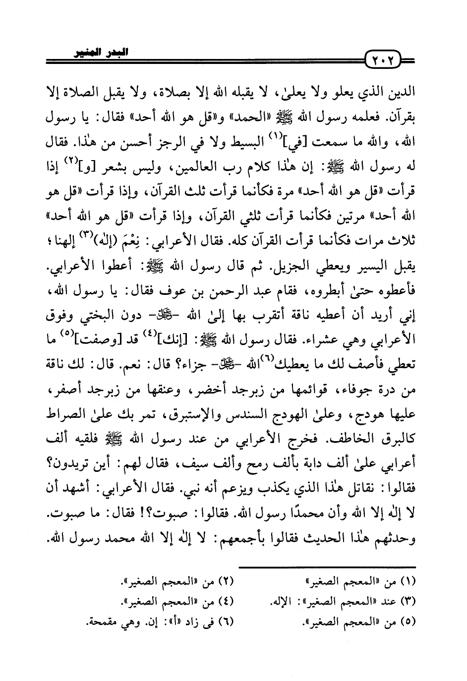 الدَّين الَّذِي يَعْلُو وَلَا يعْلى، لَا يقبله الله إِلَّا بِصَلَاة، وَلَا يقبل الصَّلَاة إِلَّا بقرآن. فَعلمه رَسُول الله - صَلَّى الله عَلَيْهِ وَسلم - «الْحَمد» و «قل هُوَ الله أحد» فَقَالَ: يَا رَسُول الله، وَالله مَا سَمِعت [فِي] الْبَسِيط وَلَا فِي الرجز أحسن من هَذَا. فَقَالَ لَهُ رَسُول الله - صَلَّى الله عَلَيْهِ وَسلم -: إِن هَذَا كَلَام رب الْعَالمين، وَلَيْسَ بِشعر [و] إِذا قَرَأت «قل هُوَ الله أحد» مرّة فَكَأَنَّمَا قَرَأت ثلث الْقُرْآن، وَإِذا قَرَأت «قل هُوَ الله أحد» مرَّتَيْنِ فَكَأَنَّمَا قَرَأت ثُلثي الْقُرْآن، وَإِذا قَرَأت «قل هُوَ الله أحد» ثَلَاث مَرَّات فَكَأَنَّمَا قَرَأت الْقُرْآن كُله. فَقَالَ الْأَعرَابِي: نِعْمَ (إِلَه) إلهنا؛ يقبل الْيَسِير وَيُعْطِي الجزيل. ثمَّ قَالَ رَسُول الله - صَلَّى الله عَلَيْهِ وَسلم -: أعْطوا الْأَعرَابِي. فَأَعْطوهُ حَتَّى أبطروه، فَقَامَ عبد الرَّحْمَن بن عَوْف فَقَالَ: يَا رَسُول الله، إِنِّي أُرِيد أَن أعْطِيه نَاقَة أَتَقَرَّب بهَا إِلَى الله - عَزَّ وَجَلَّ - دون البختي وَفَوق الْأَعرَابِي وَهِي عشراء. فَقَالَ رَسُول الله - صَلَّى الله عَلَيْهِ وَسلم -: [إِنَّك] قد [وصفت] مَا تُعْطِي فأصف لَك مَا يعطيك الله - عَزَّ وَجَلَّ - جَزَاء؟ قَالَ: نعم. قَالَ: لَك نَاقَة من درة جوفاء، قَوَائِمهَا من زبرجد أَخْضَر، وعنقها من زبرجد أصفر، عَلَيْهَا هودج، وَعَلَى الهودج السندس والإستبرق، تمر بك عَلَى الصِّرَاط كالبرق الخاطف. فَخرج الْأَعرَابِي من عِنْد رَسُول الله - صَلَّى الله عَلَيْهِ وَسلم - فَلَقِيَهُ ألف أَعْرَابِي عَلَى ألف دَابَّة بِأَلف رمح وَألف سيف، فَقَالَ لَهُم: أَيْن تُرِيدُونَ؟ فَقَالُوا: نُقَاتِل هَذَا الَّذِي يكذب وَيَزْعُم أَنه نَبِي. فَقَالَ الْأَعرَابِي: أشهد أَن لَا إِلَه إِلَّا الله وَأَن مُحَمَّدًا رَسُول الله. فَقَالُوا: صبوت؟ ! فَقَالَ: مَا صبوت. وَحَدَّثَهُمْ هَذَا الحَدِيث فَقَالُوا بأجمعهم: لَا إِلَه إِلَّا الله مُحَمَّد رَسُول الله.